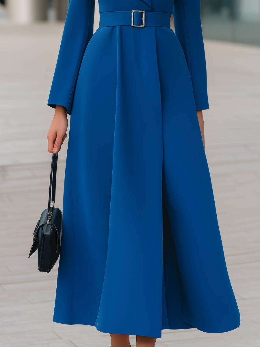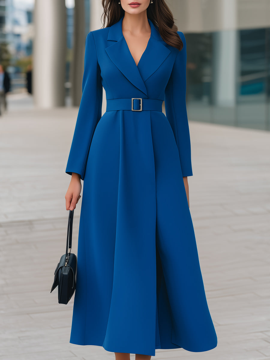 Mooyius presents an elegant statement piece that brings together modern tailoring and timeless sophistication. This royal blue maxi dress is crafted to embody confidence and grace, featuring a sharp notched lapel neckline that transitions seamlessly into a structured bodice.