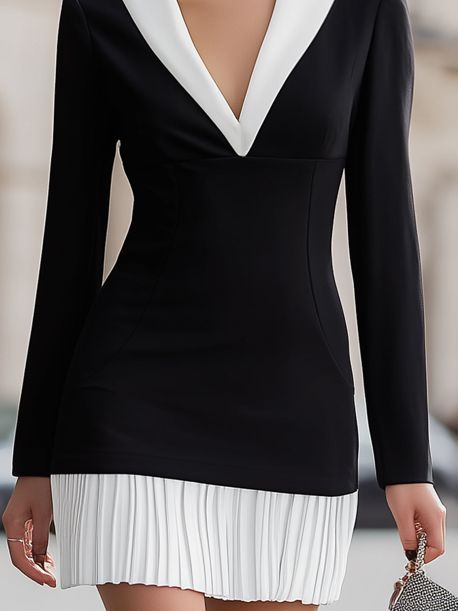 Mooyius presents the stunning black and white mini dress. Designed with a deep V-neckline framed by a bold white lapel collar, this dress exudes modern sophistication. The sleek long sleeves and structured silhouette create a flattering shape, while the pleated white hem adds a playful, feminine twist.