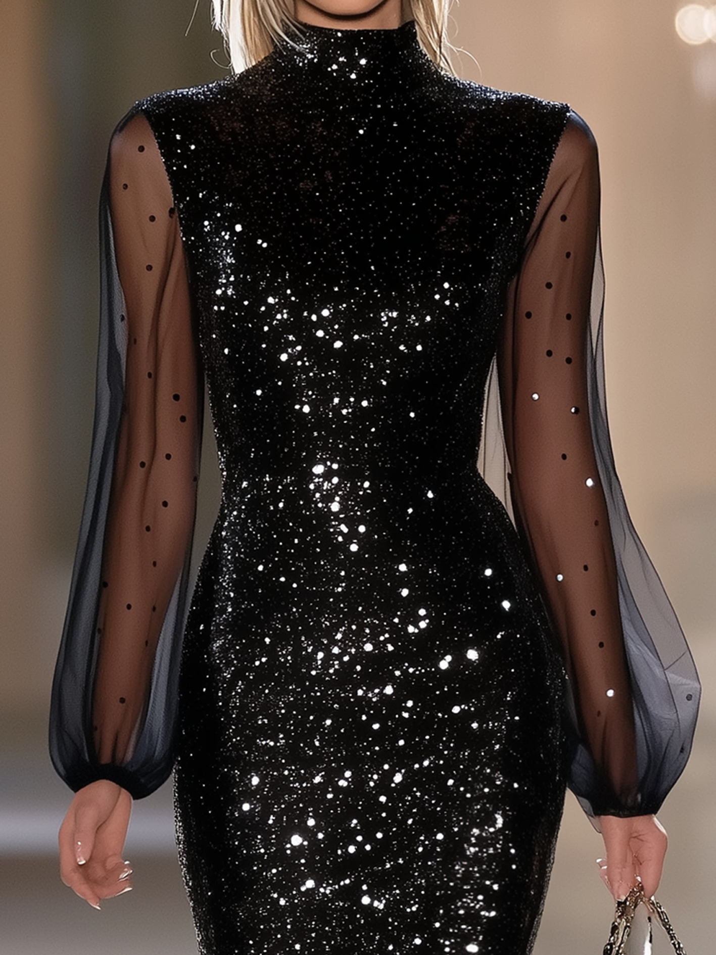 Mooyius presents a dazzling celebration of elegance and allure with this black sequin sheath dress. Designed to sculpt and shimmer, the figure-hugging silhouette is fully embellished in sequins, capturing the light with every movement. The high neckline and midi hem lend a refined shape, while the sheer dotted mesh sleeves introduce a touch of ethereal drama. Balloon cuffs add volume and softness, balancing the glimmer with graceful transparency.