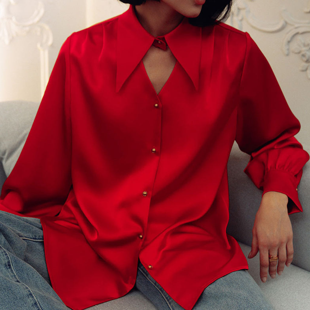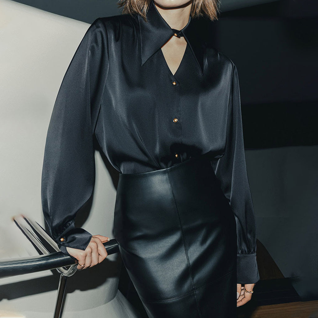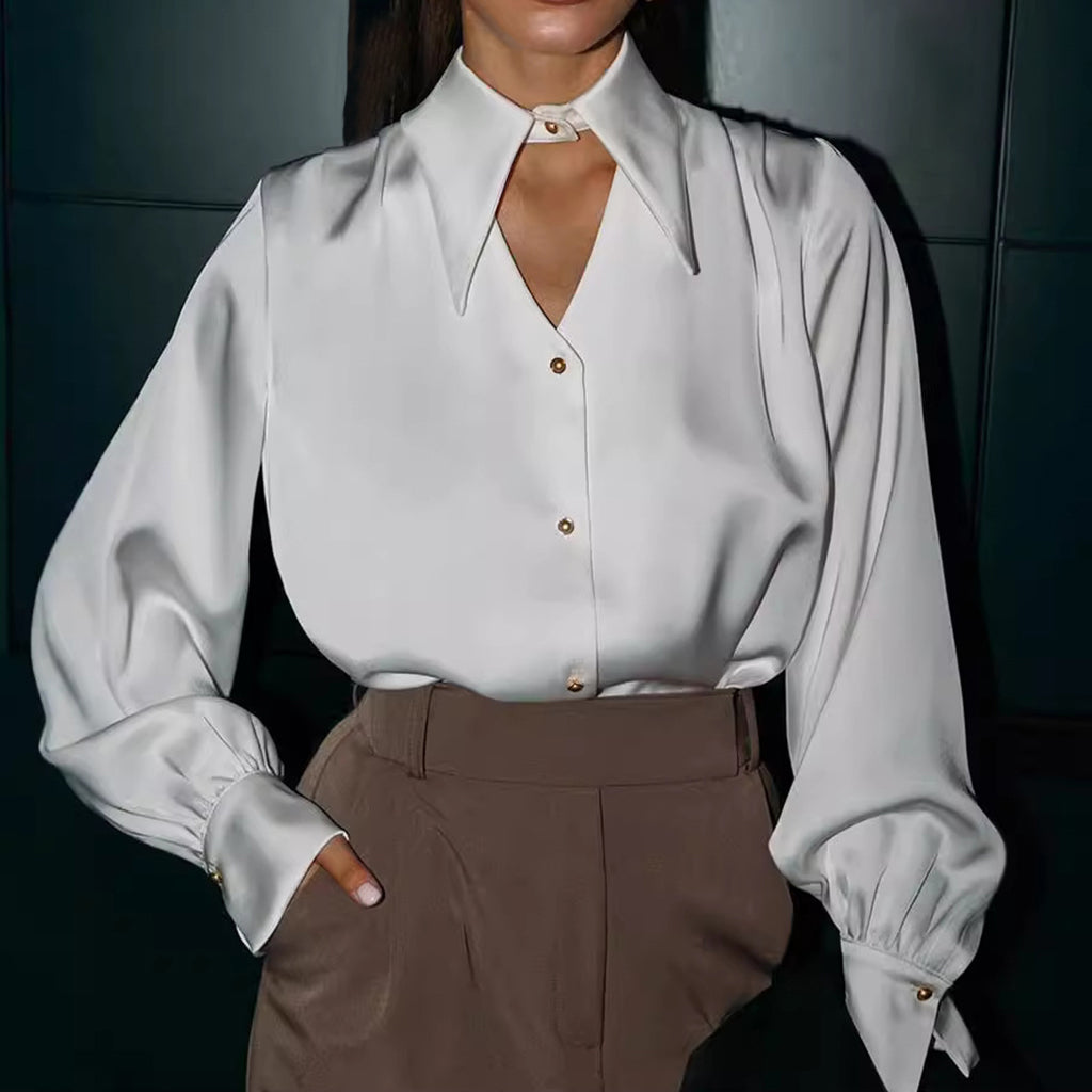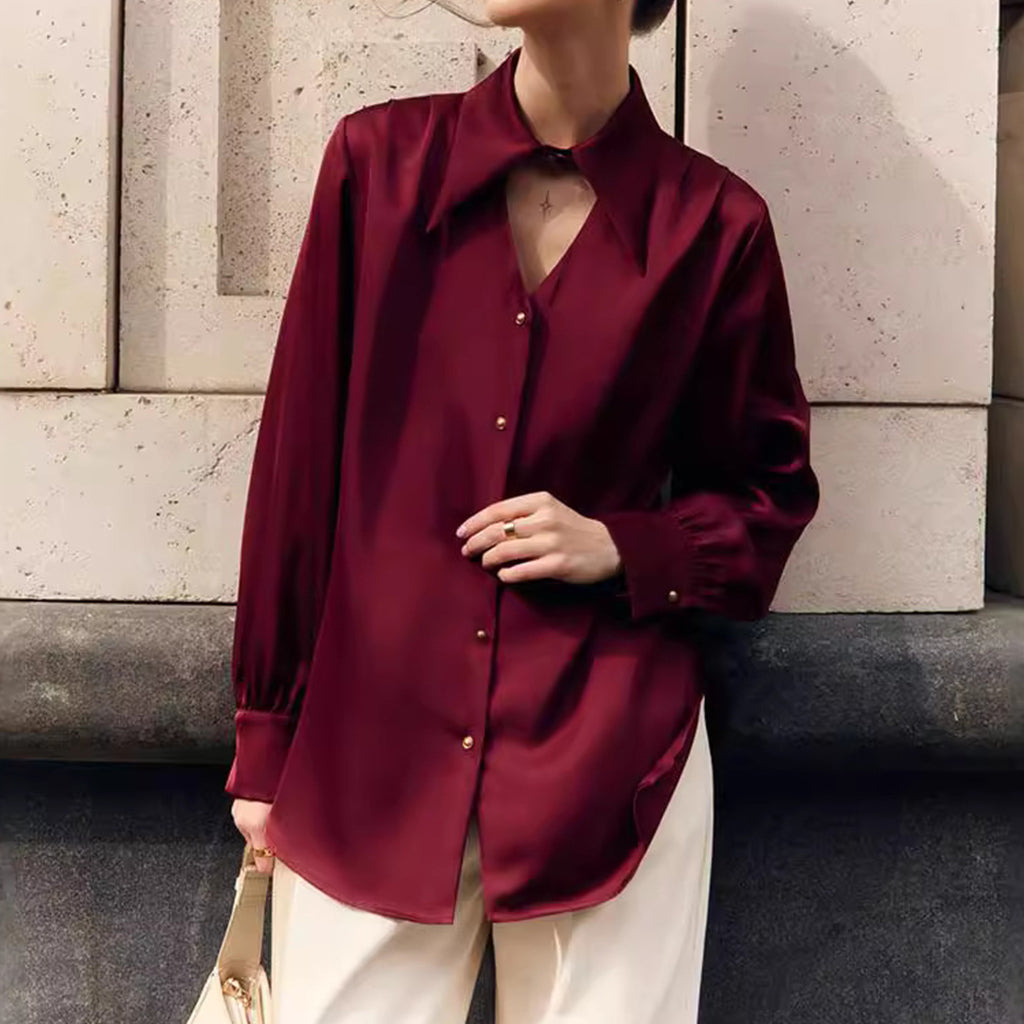 Elegant Bow Tie Neckline Cut Out Long Sleeve Satin Blouse