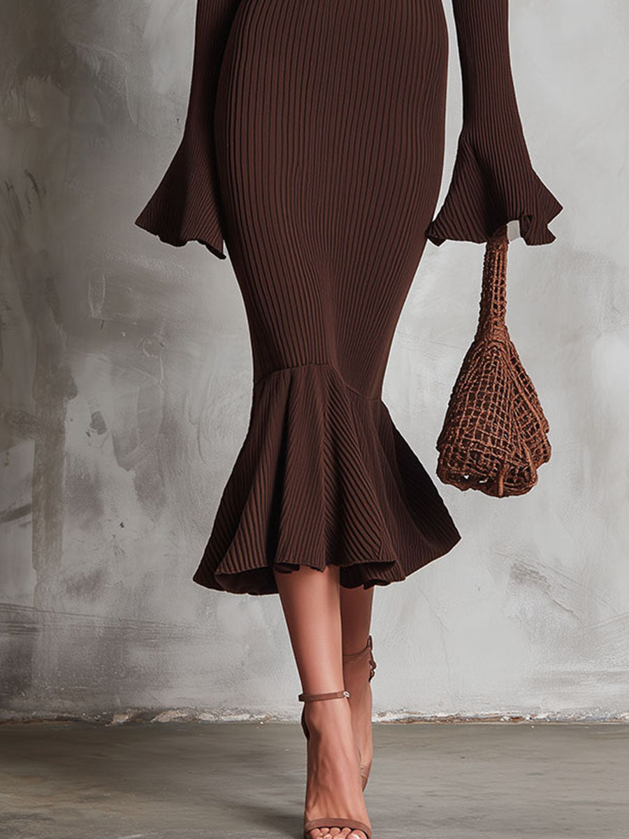 Elegant Brown Ribbed Knit Flared Cuffs Mermaid Midi Dress