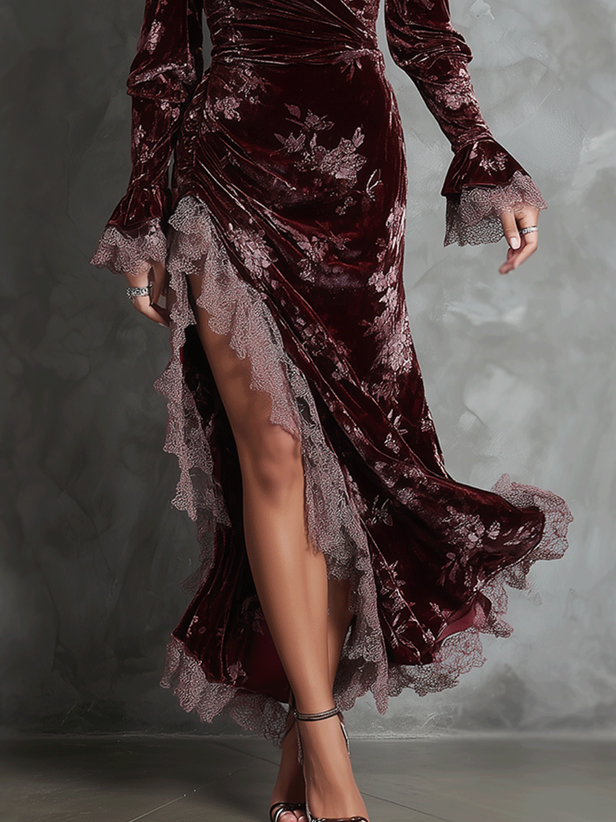 Elegant Burgundy Velvet Wrap Lace Trim Slit Maxi Dress