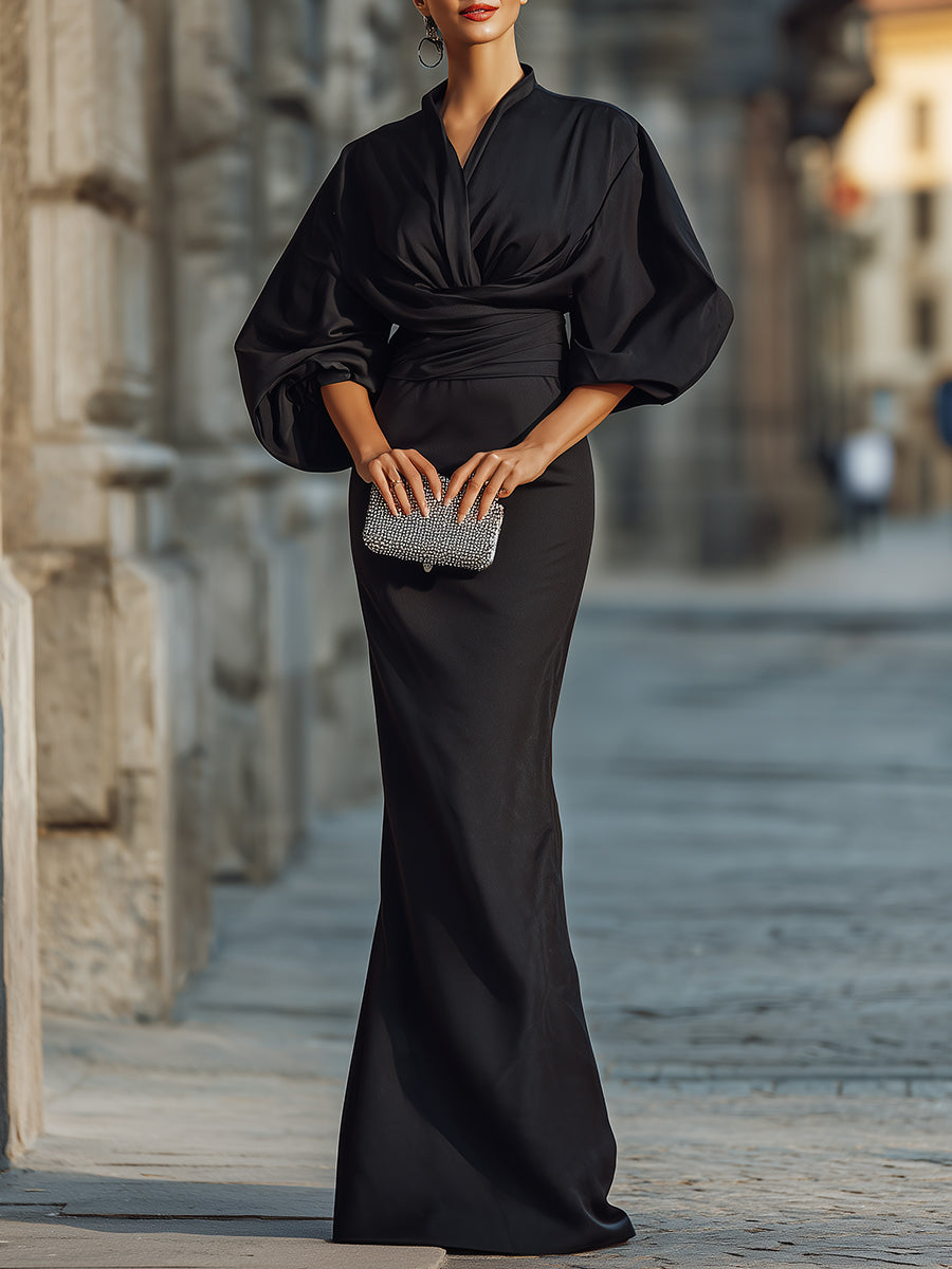 The Mooyius Black Draped Evening Gown captures the essence of timeless elegance with a contemporary twist. This floor-length masterpiece features a fluid draped bodice with a deep V-neckline, creating a soft yet structured silhouette. The voluminous bishop sleeves add dramatic refinement, while the cinched waist enhances the feminine form and transitions seamlessly into a sleek, fitted skirt that elongates the figure.