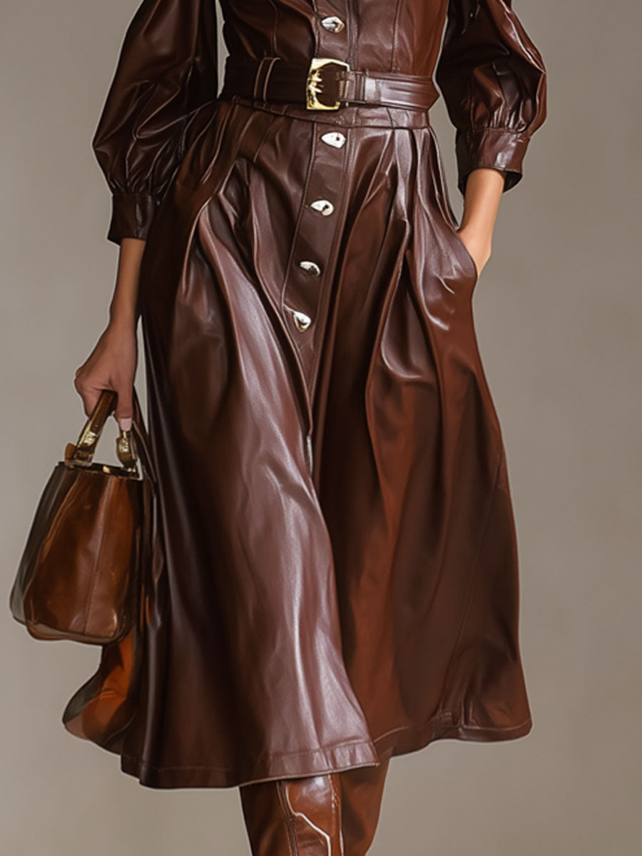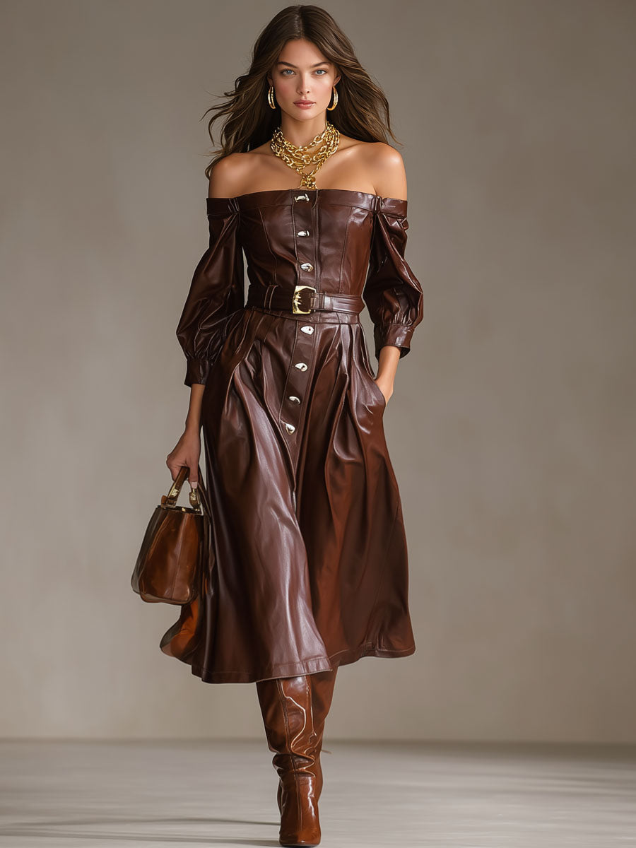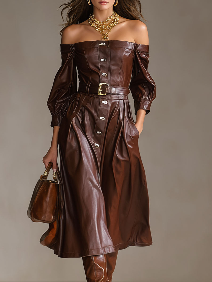 Elegant Faux Leather Off-the-shoulder Long-sleeved Button Midi Dress