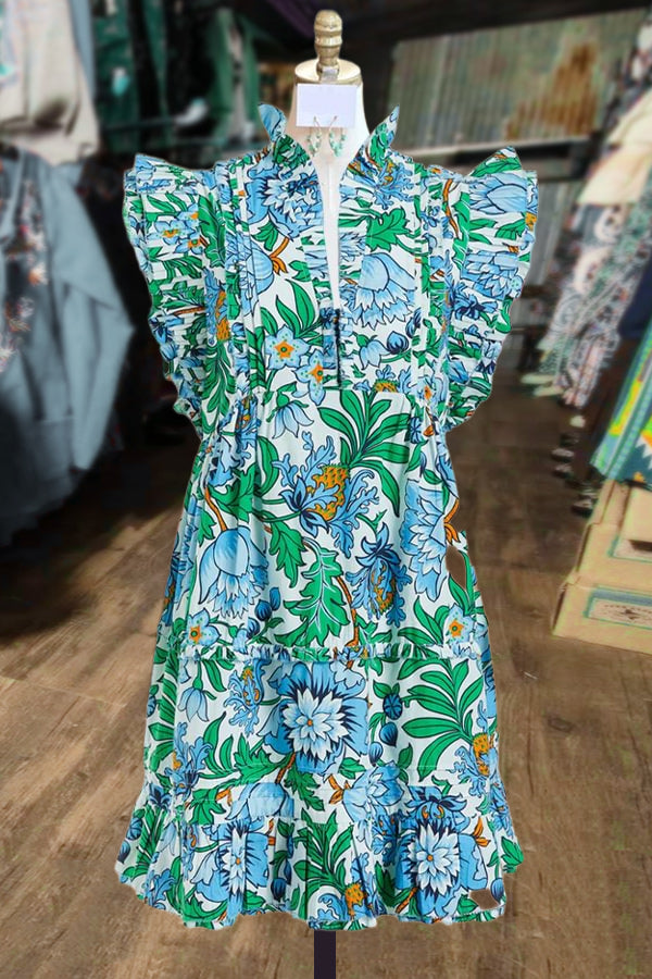 Elegant Floral Print Ruffle Sleeve V-Neck Tiered Mini Dress