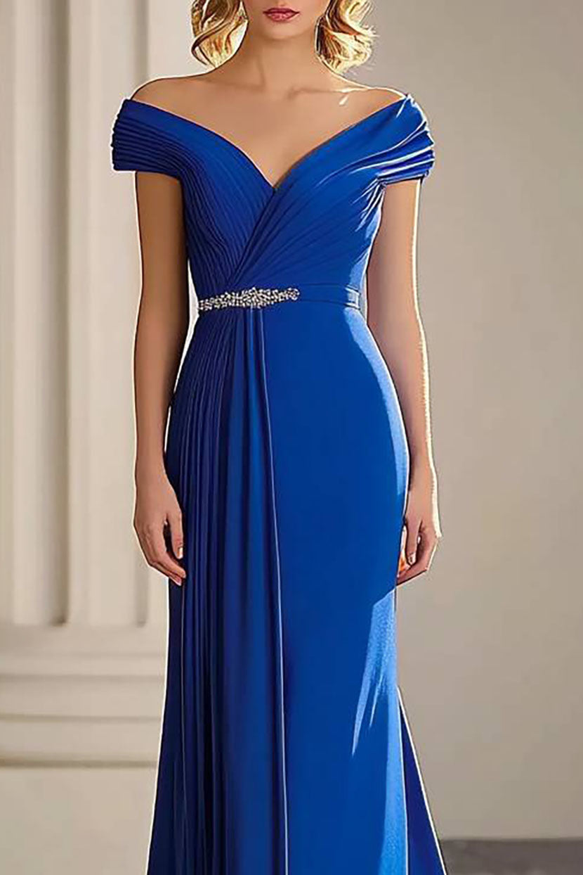 Elegant Formal Off-Shoulder Dress Waist Detail Pleated Floor-Length Dress