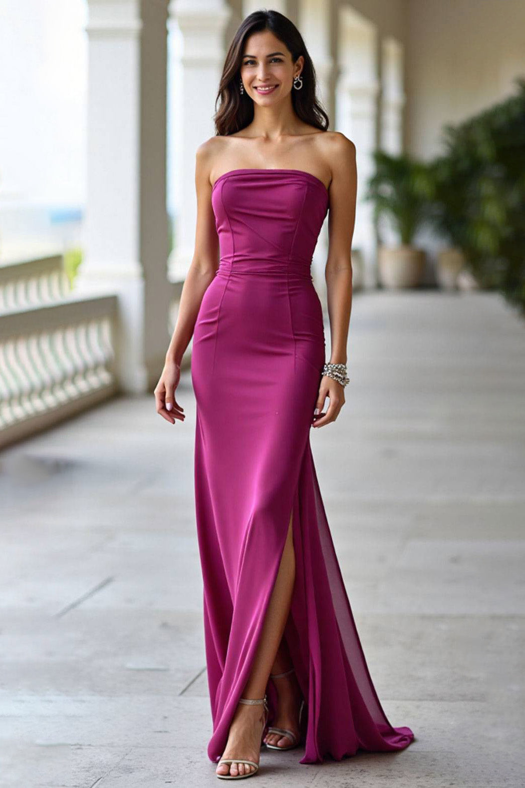 This elegant purple gown features a strapless neckline and a side slit for added sophistication. Made of soft chiffon, it offers a graceful drape, making it ideal for formal events and elegant occasions.