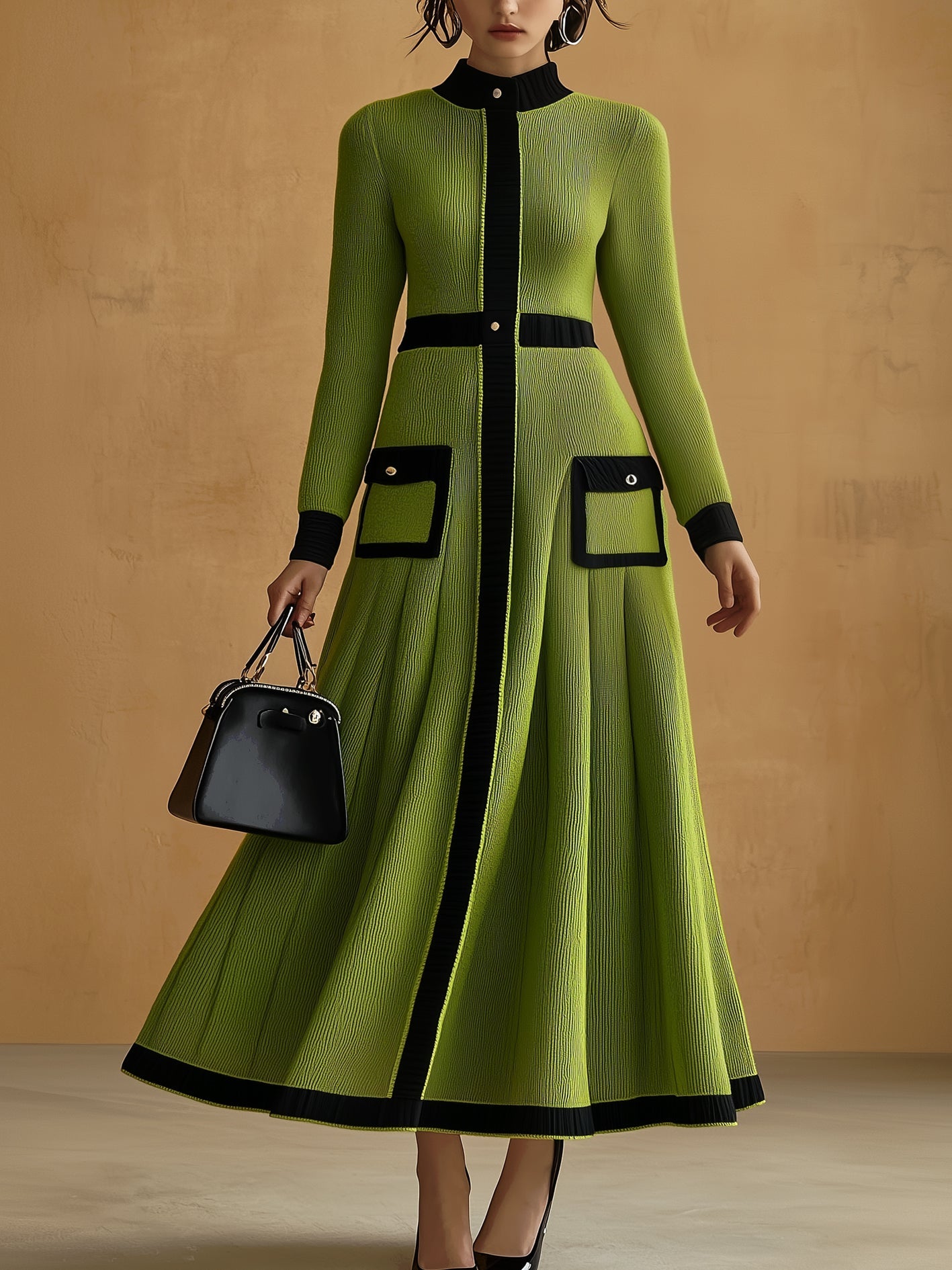 Unveil a bold yet refined wardrobe statement with the Mooyius Green Ribbed Knit Midi Dress, where modern tailoring meets timeless elegance. This captivating piece is crafted in a rich chartreuse green and accented with dramatic black contrast trim along the collar, placket, waistband, cuffs, hem, and oversized flap pockets. The result is a sharp, graphic silhouette that feels equally polished and fashion-forward.