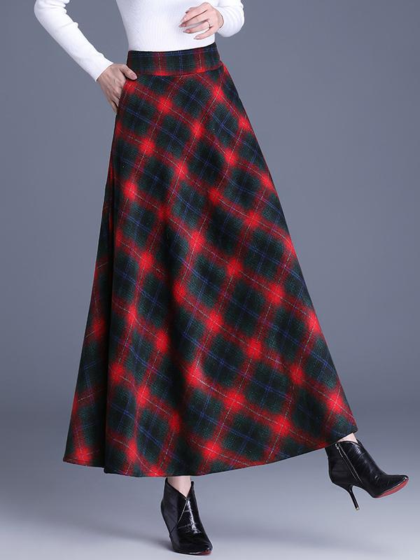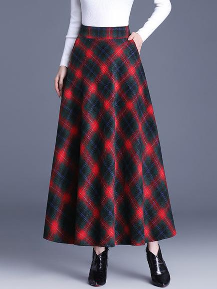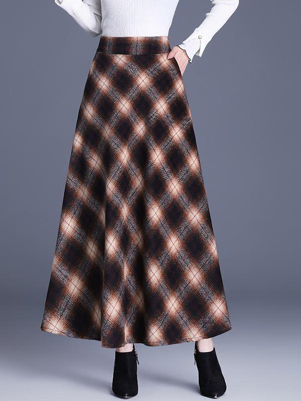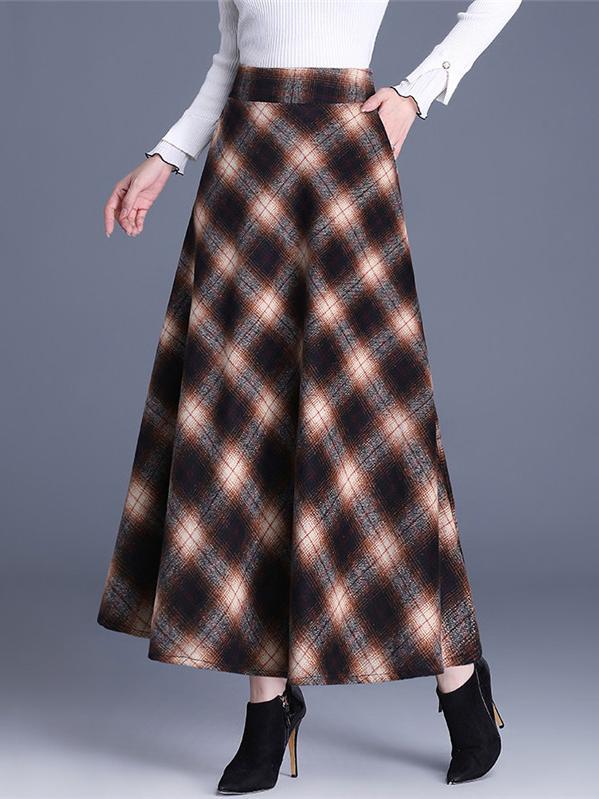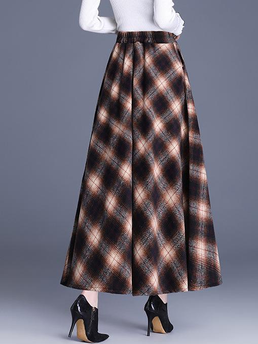 Elegant High-waist Color-block Grid Wool Blend Long Skirt