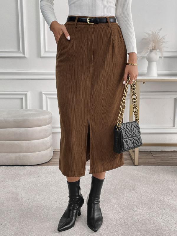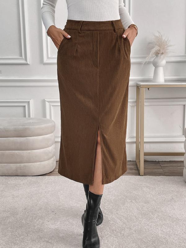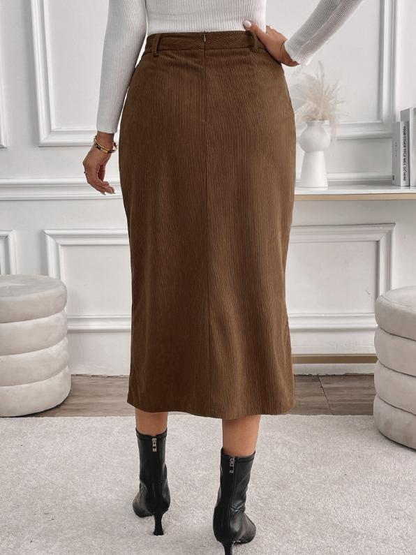 This half skirt features a unique design with a rear zipper for easy wearing, enhancing its overall simplicity. The side pockets not only add practicality but also contribute to a relaxed vibe. The middle slit in the hem highlights the leg line, adding a touch of sensuality and movement. The solid-colored corduroy fabric provides a warm texture and a vintage charm, making it suitable for various outfits and an ideal piece for the autumn and winter seasons.