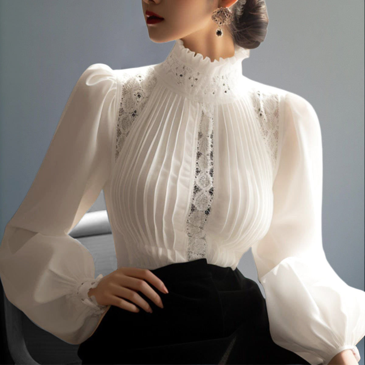 Elegant Mock Neck Puff Sleeve Pleated Lace Blouse