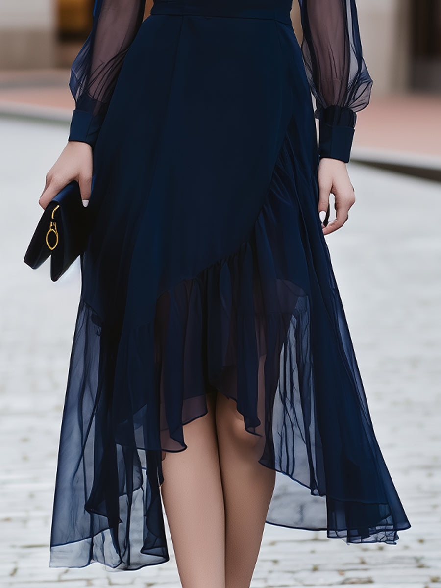 Mooyius presents the elegant navy blue midi dress, featuring delicate sheer sleeves and a flattering fitted bodice. The soft chiffon fabric gracefully flows into an asymmetrical ruffled hem, adding a touch of romantic sophistication. Perfect for evening events, dinner dates, or special occasions, this dress combines timeless style with modern details.