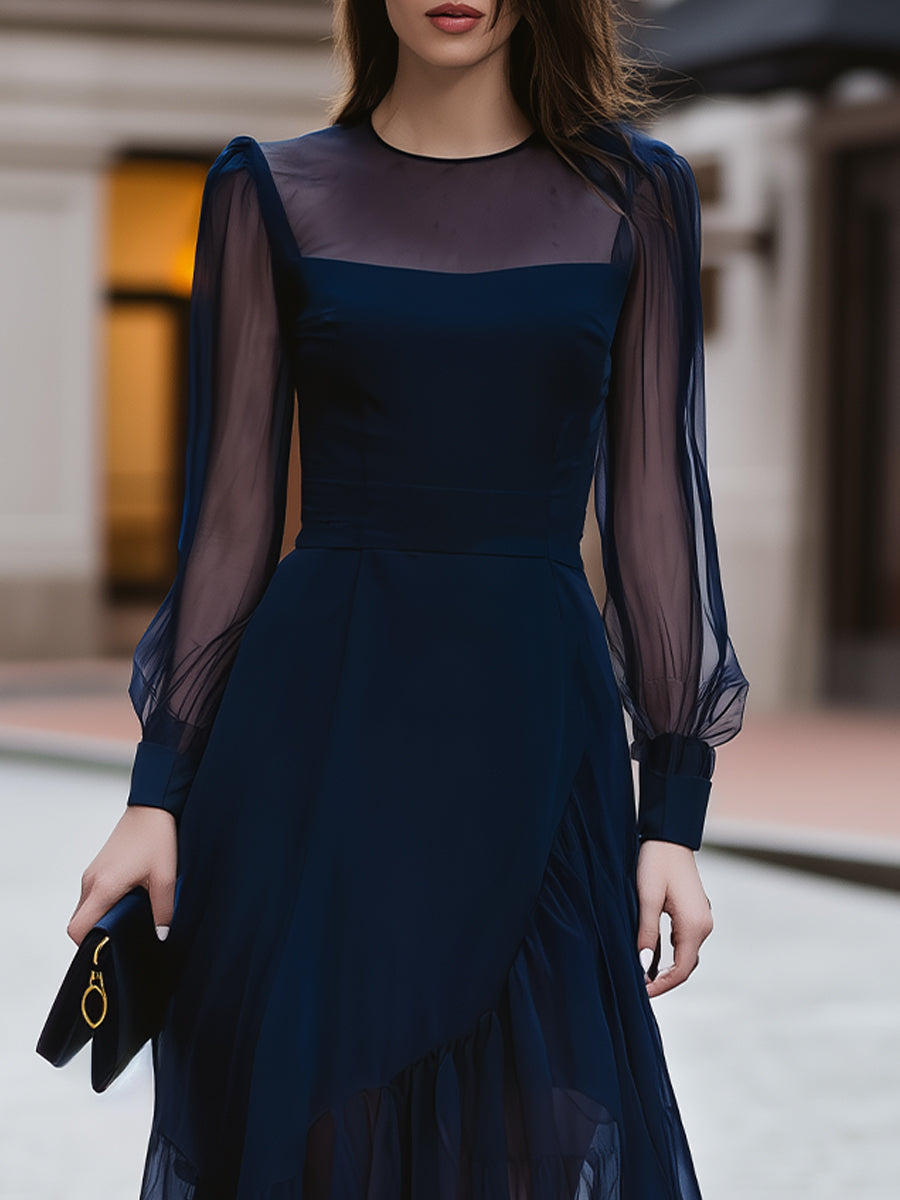 Elegant Navy Blue Sheer Sleeve Midi Dress