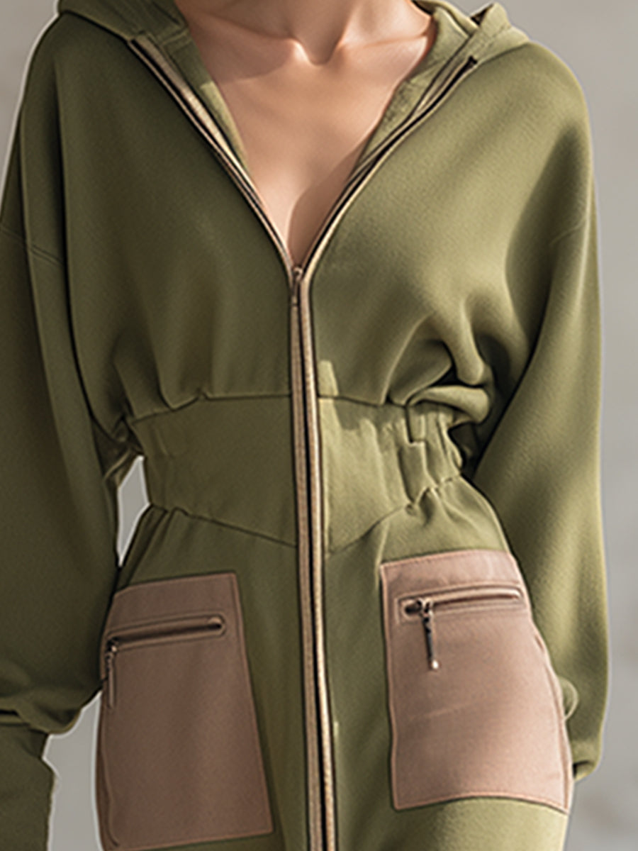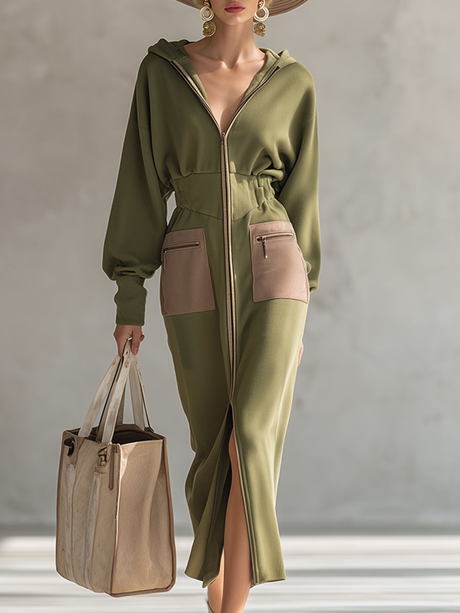 Elegant Olive Green Hooded Narrow Waist Zip-up Sweatshirt Long Sleeve Maxi Dress