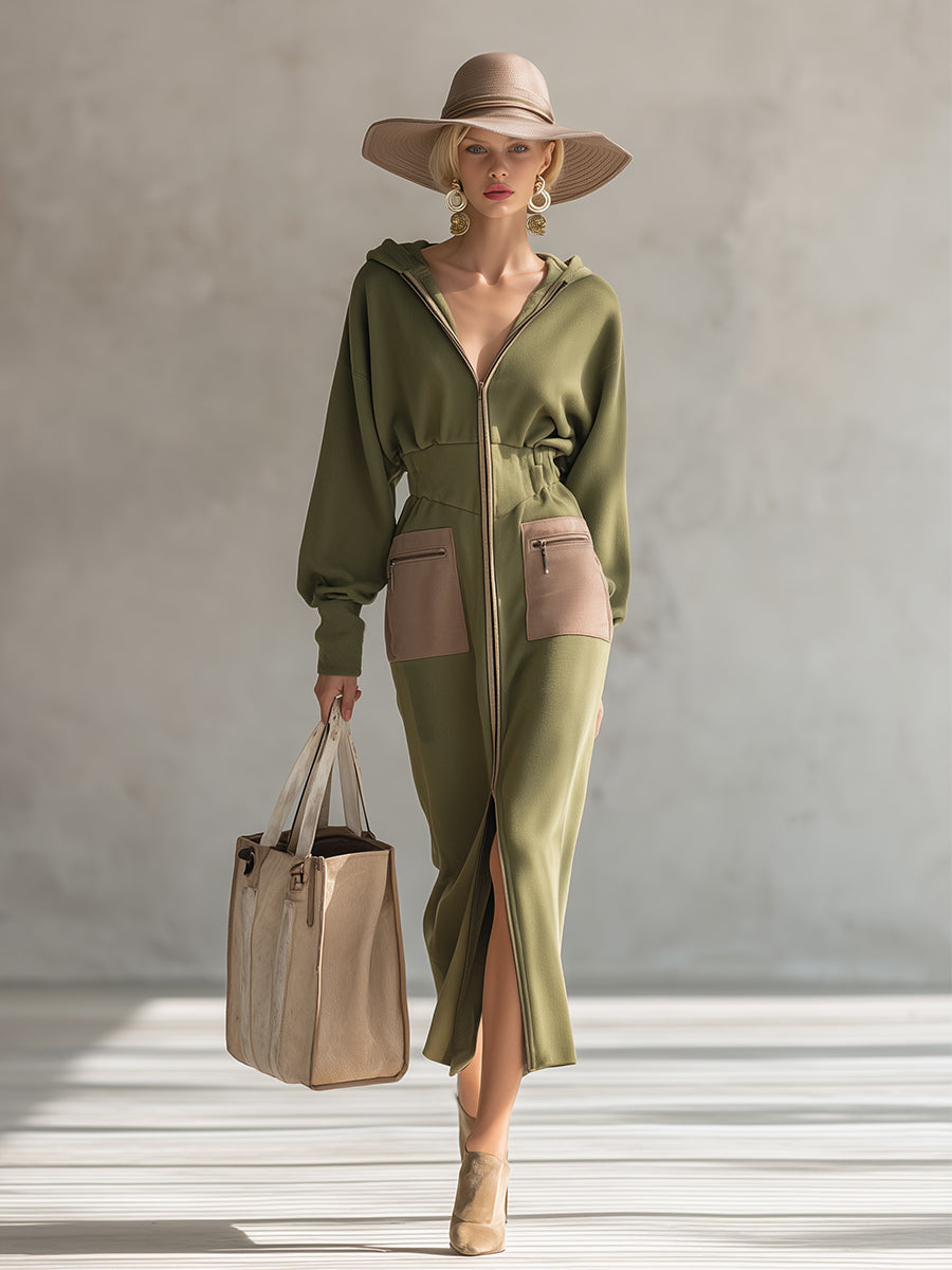 This elegant olive green hooded, narrow-waisted, zip-up sweatshirt maxi dress with long sleeves perfectly blends casual comfort with urban sophistication. Featuring a striking olive green design and a unique hood, this maxi dress combines style and functionality. The narrow waist enhances the flattering silhouette, while the long sleeves ensure excellent coverage and warmth in transitional weather.