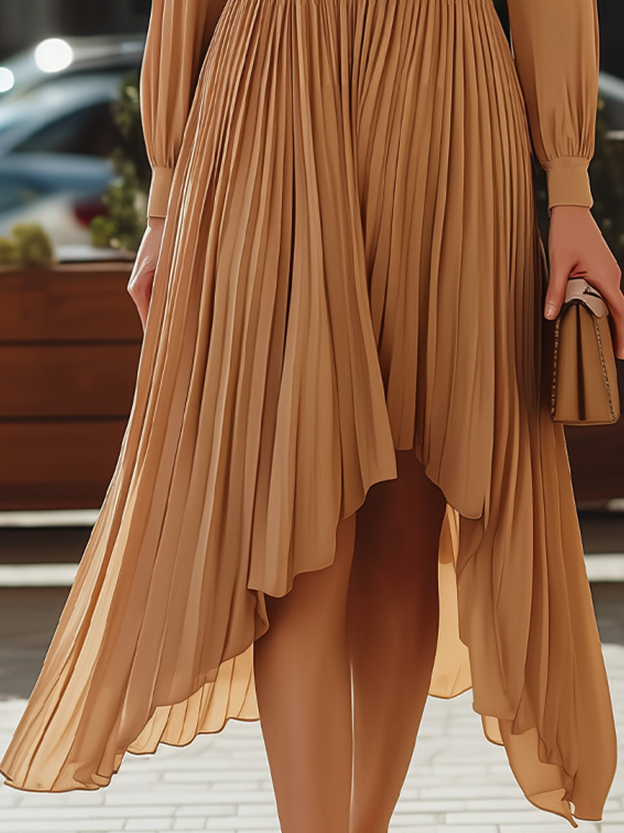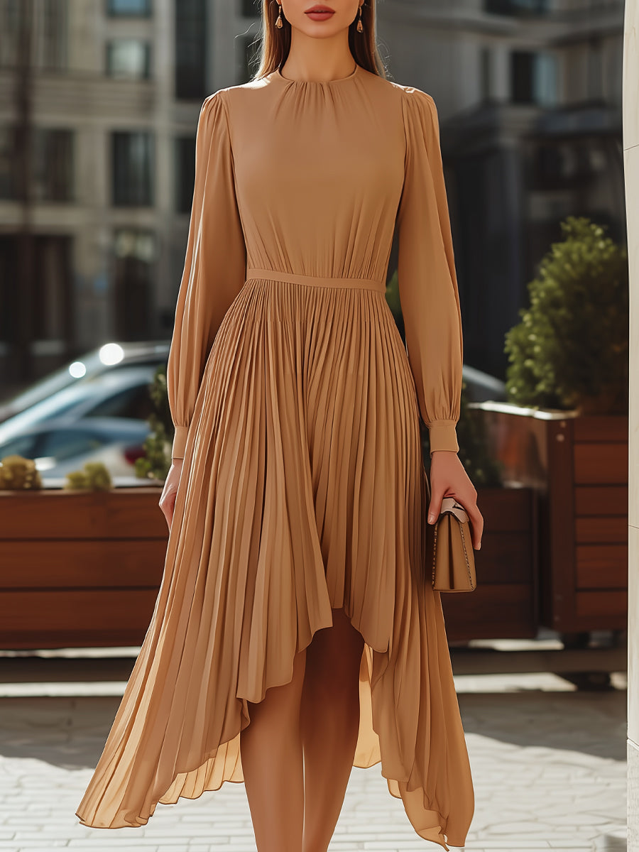 Mooyius presents the Elegant Pleated High-Low Midi Dress. This sophisticated camel brown dress features a flattering high neckline, long puffed sleeves, and a finely pleated skirt with an asymmetrical hem that flows gracefully with every step. The fitted waistline accentuates your silhouette, making it a perfect choice for weddings, sunset dinners, or elegant daytime events.