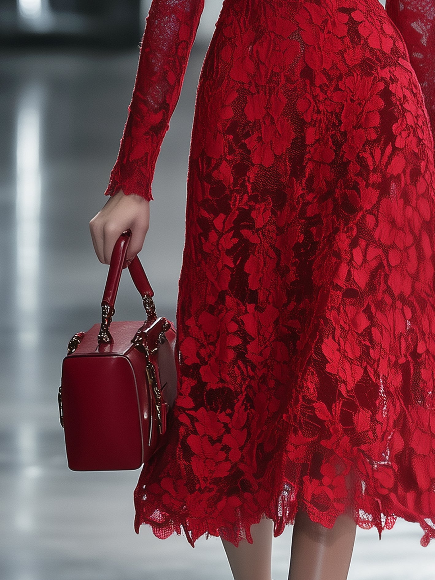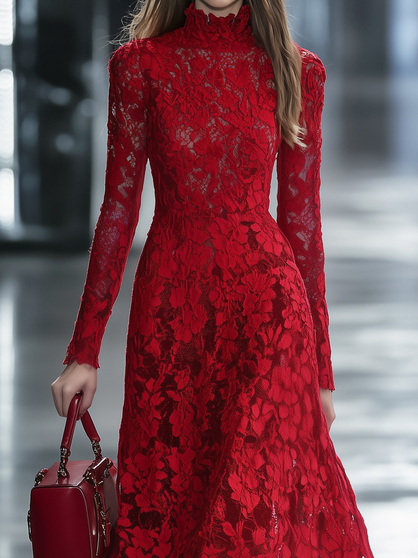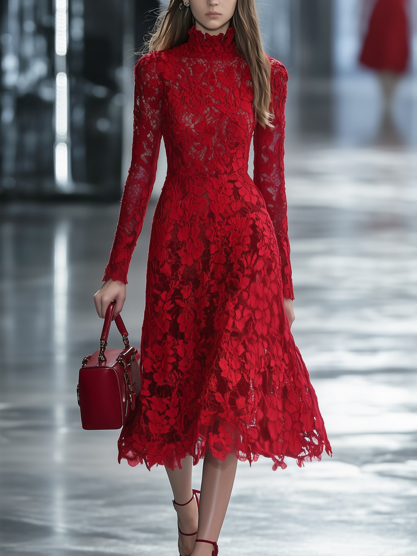 Mooyius unveils a romantic vision in crimson with this captivating lace midi dress. Intricately crafted from sheer floral lace, the dress features a high neckline, long sleeves, and a softly flared A-line silhouette. The elegant structure is lined through the bodice and skirt, allowing the sleeves and hemline to reveal delicate transparency. Every detail—from the fitted waist to the scalloped edges—evokes timeless sophistication and graceful movement.