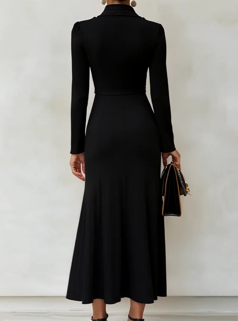 Perfectly balancing sophistication and flair, the dress flatters with its long fitted sleeves and a subtly cinched waist, ensuring a poised silhouette from every angle. Whether worn for gallery openings, holiday dinners, or executive events, this all-black ensemble delivers high-impact style with minimal effort. Pair with pointed pumps and a structured handbag to complete the look.