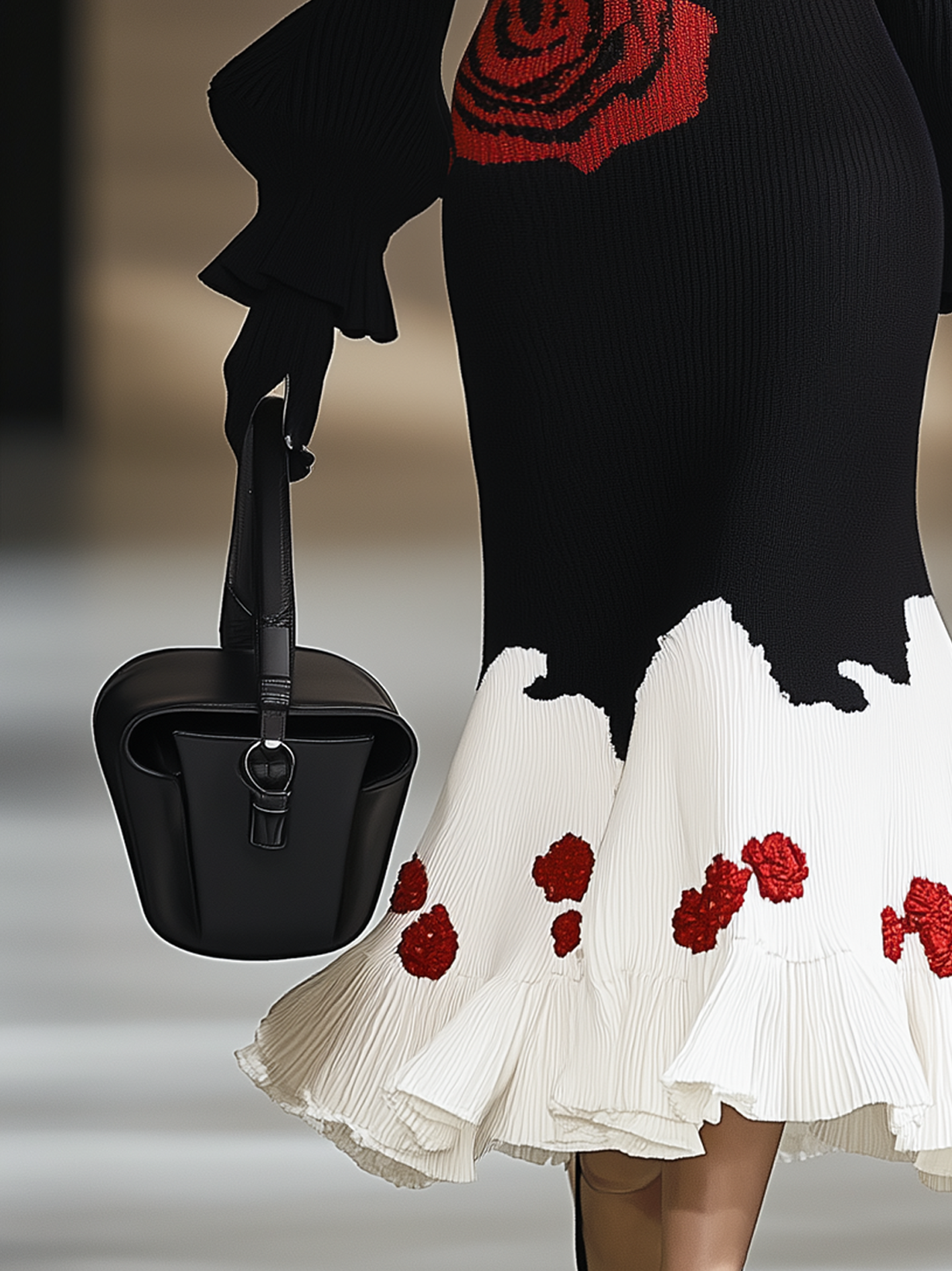 Bold yet romantic, this Mooyius knit dress is an expressive statement in motion. Crafted from a structured ribbed knit, the form-fitting bodice is balanced by fluted bell sleeves and a playful fishtail hemline. A vivid red rose intarsia blooms at the hip, complemented by cascading red floral accents at the hem — each flower adding visual texture and artistry.