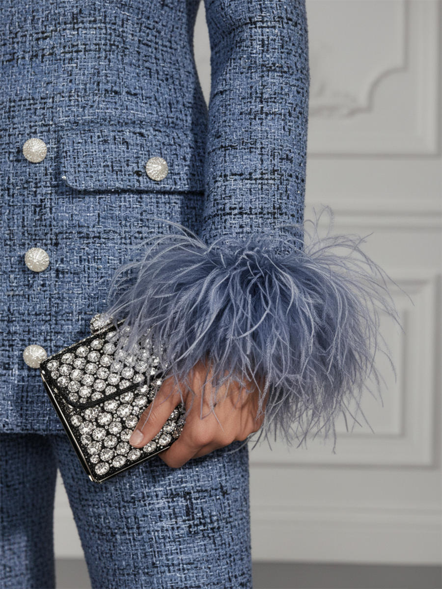 When styling this set, consider playing up its sophisticated elements. Pair the set with classic heels or ankle boots to maintain a streamlined, elegant look. Accessorize minimally with elegant jewelry pieces, such as stud earrings or a thin bangle bracelet, to complement the tweed’s texture without overshadowing it. A structured handbag, perhaps in a neutral or complementary tone, can add an extra layer of sophistication.