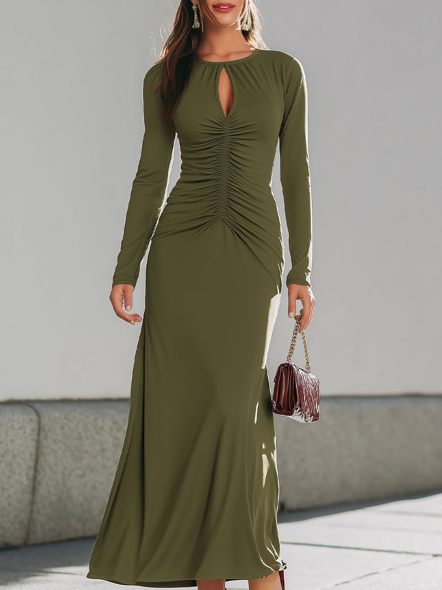 Elegant Ruched Keyhole Long Sleeve Maxi Dress