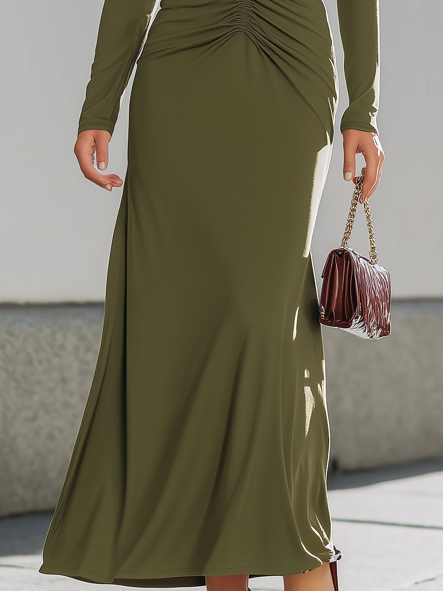 Mooyius presents the Elegant Ruched Keyhole Maxi Dress. This stunning olive green piece features a flattering ruched bodice that hugs your curves in all the right places, a tasteful keyhole neckline that adds just the right touch of allure, and long sleeves that balance elegance with coverage. Perfect for evening events, date nights, or formal gatherings, this dress delivers both comfort and glamour.
