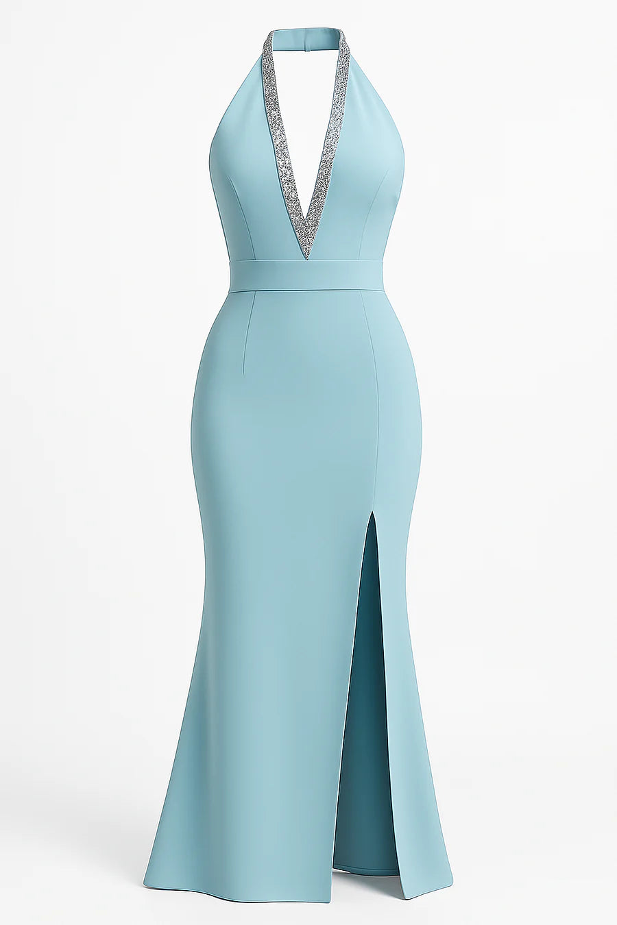Mooyius unveils a showstopping vision of modern glamour in this ice blue halter gown. Designed to captivate, the sleek silhouette hugs the body with precision while a plunging neckline trimmed in shimmering crystals draws the eye with elegance. A high front slit adds seductive movement, balancing the refined structure with contemporary allure.