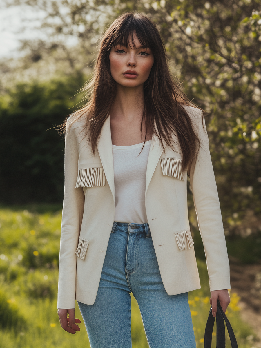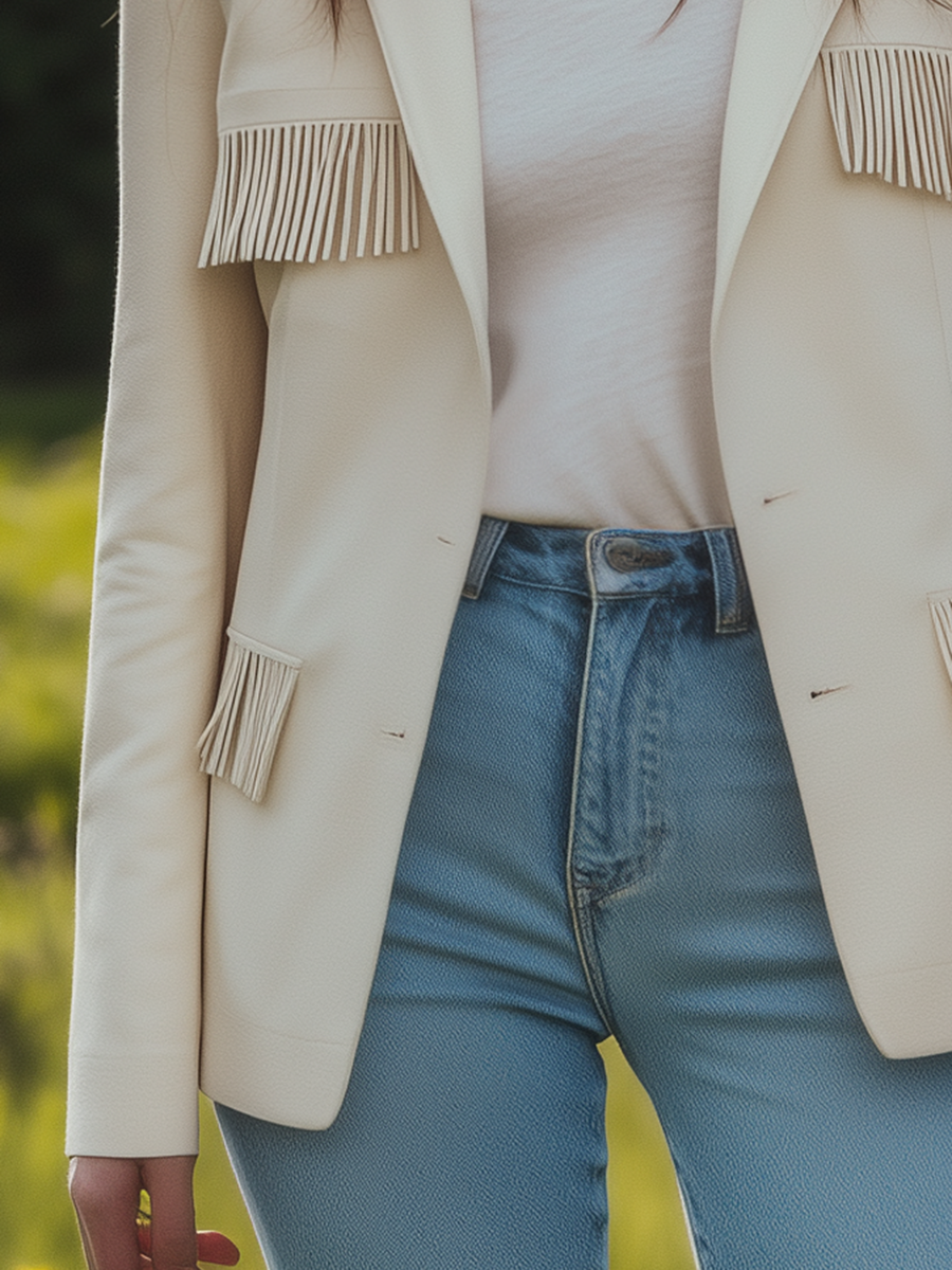 Pair the blazer with tailored trousers or a sleek pencil skirt for a polished look, or layer it over a dress to add structure and flair. Keep accessories minimal to let the tassel detail stand out, and opt for pointed-toe heels and a structured handbag to complete a refined, timeless ensemble that balances elegance with a modern edge.