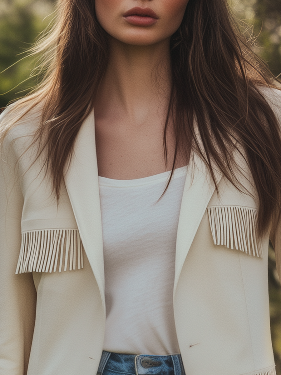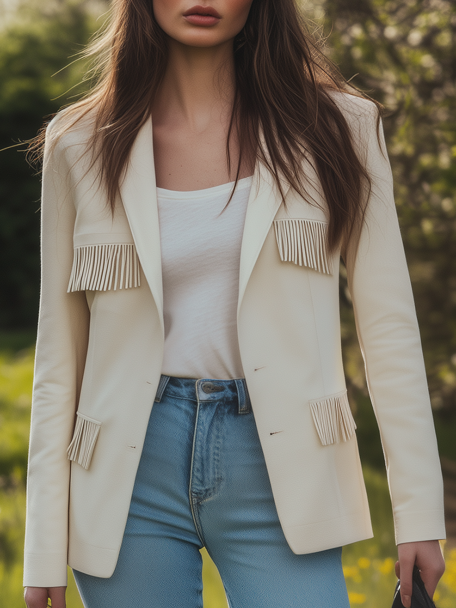 This elegant, simple solid color tassel blazer effortlessly blends classic tailoring with a subtle touch of playful sophistication. Featuring clean lines and a streamlined silhouette, the tassel detailing adds a unique accent without overwhelming the design. Its solid color enhances versatility, making it an excellent choice for both professional settings and chic evening outings.