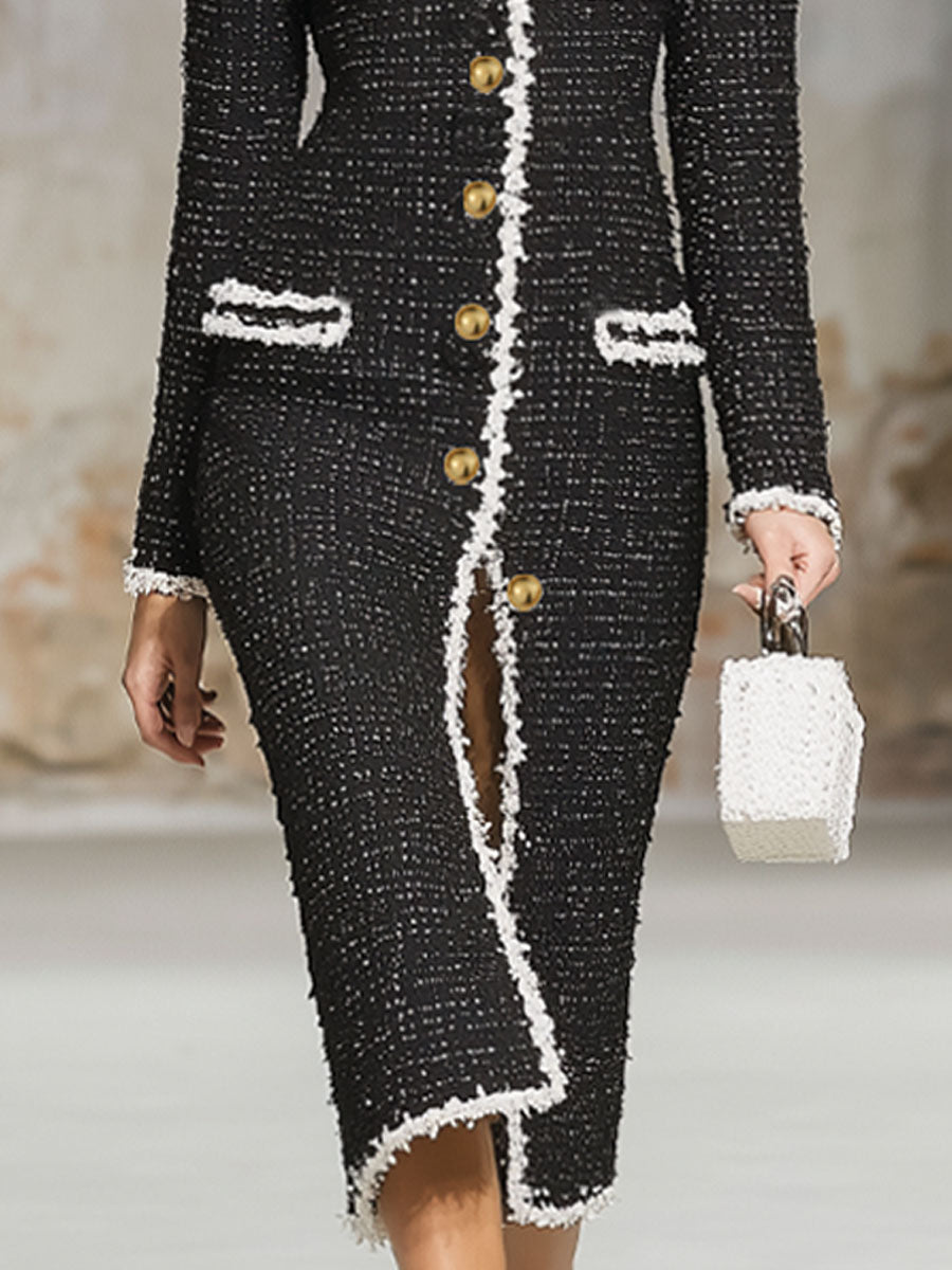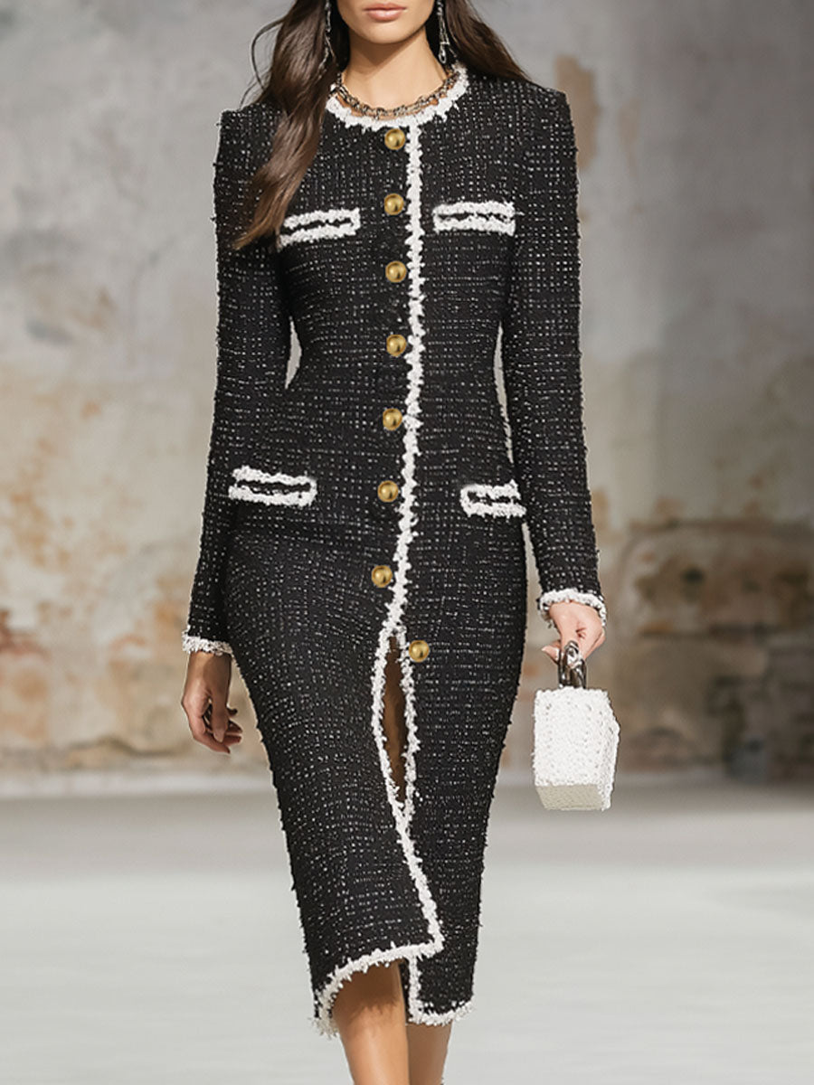 Elegant Textured Fabric Ribbon Multi-button Midi Dress
