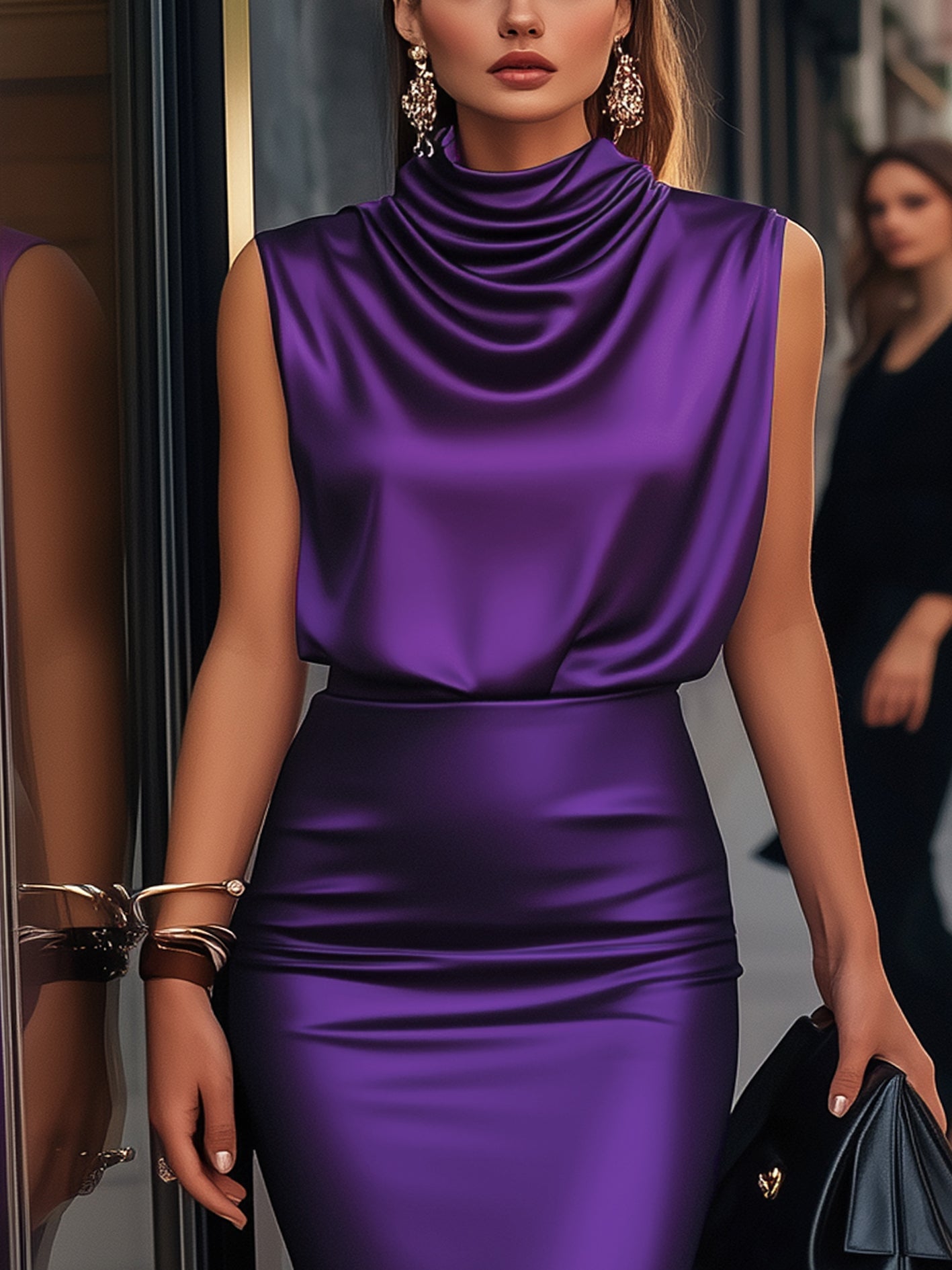 Elegant Tiered Cowl Neckline Sleeveless Dark Purple Satin Midi Dress