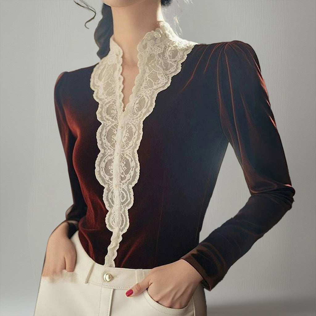 Elegant Velvet Lace Patchwork Stand Collar Button Long Sleeve Blouse