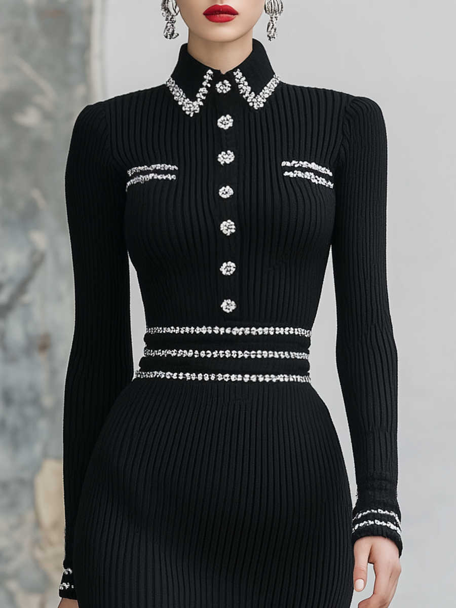 Elegant Vintage Contrast-trimmed Lapel Knitted Midi Dress