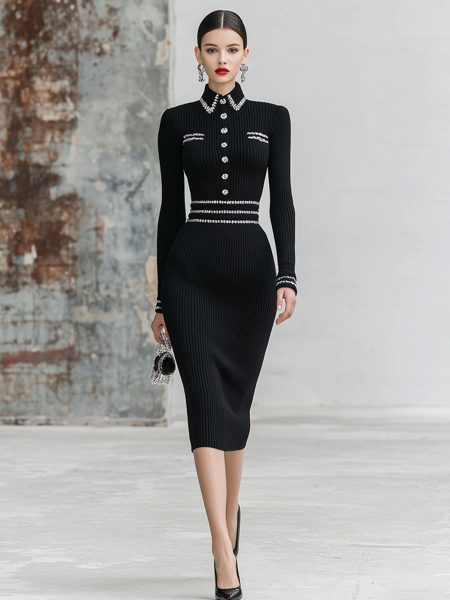 Perfect for formal gatherings or stylish daytime events, pair this dress with classic pumps and minimal accessories to complete a poised look. This contrast-trimmed lapel knitted midi dress beautifully blends vintage elegance with modern comfort, making it a versatile addition to any wardrobe.