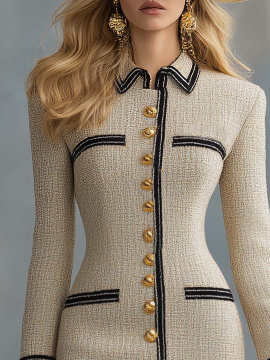 Elegant Vintage Front Button Black Piping Beige Tweed Mini Dress