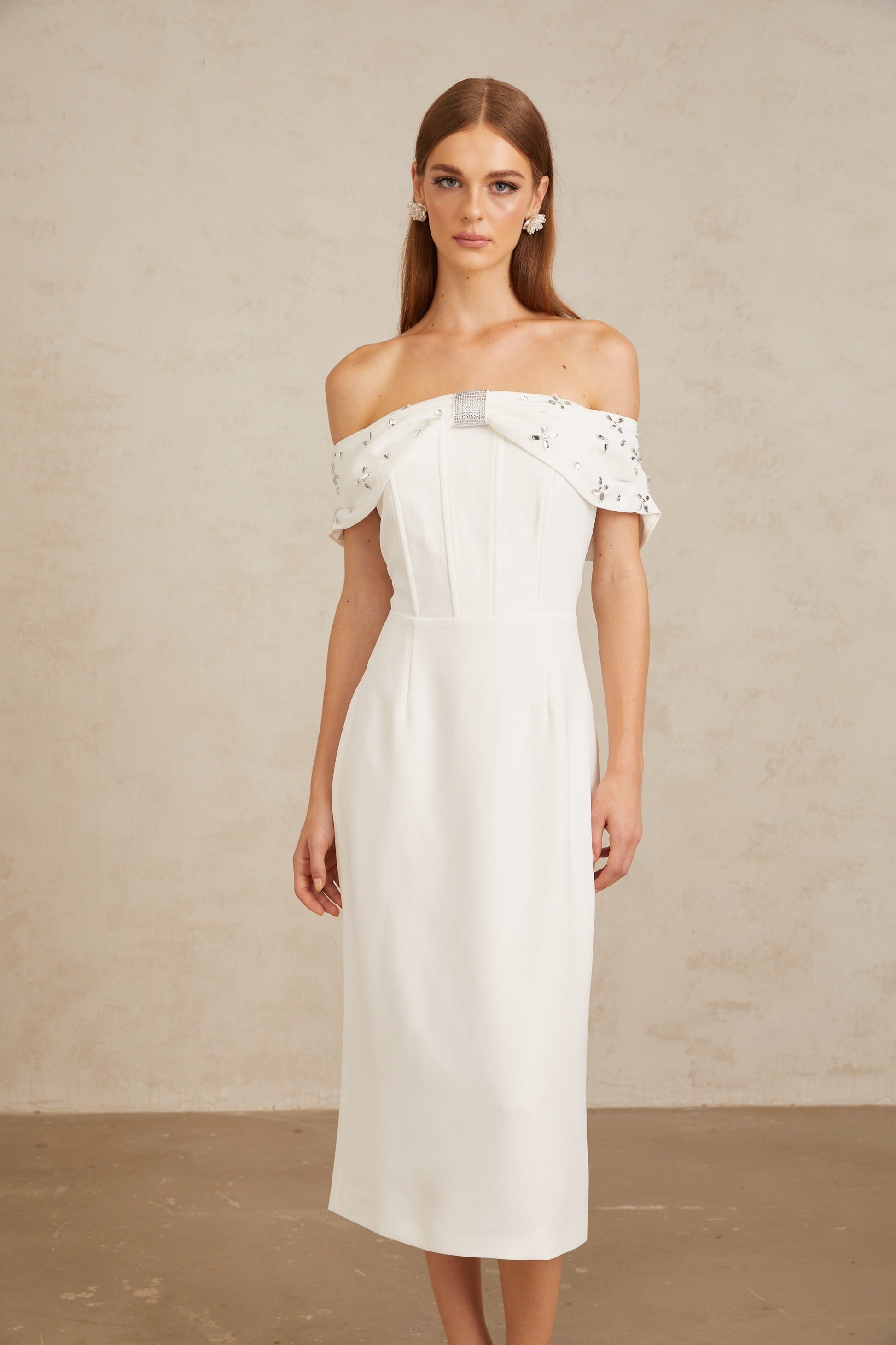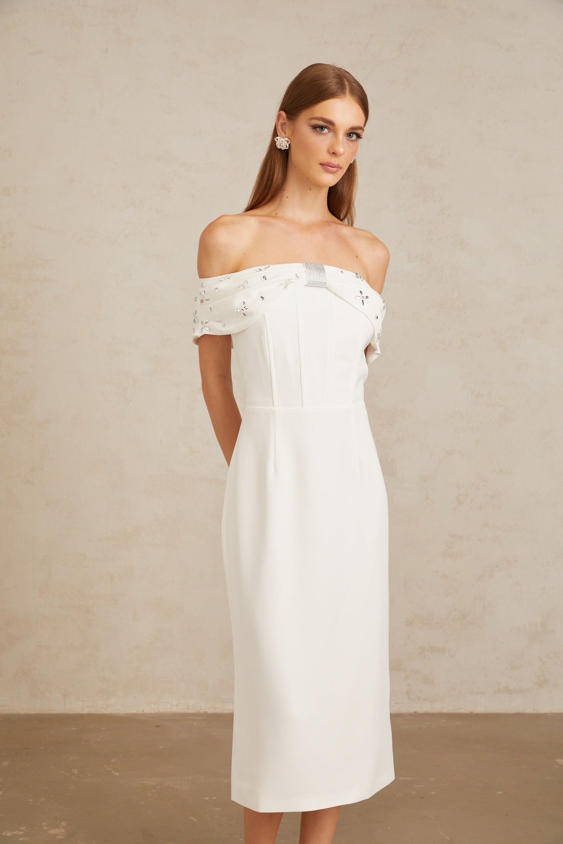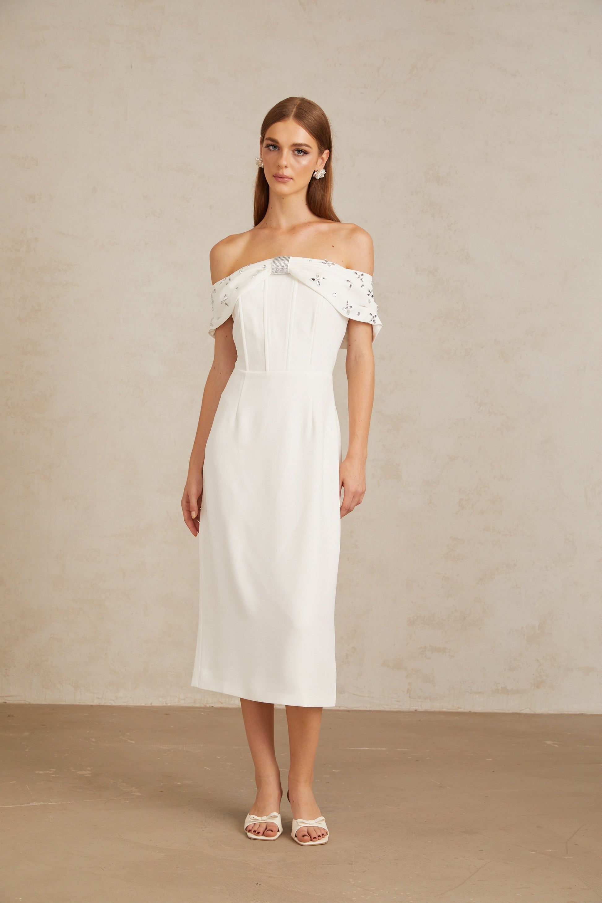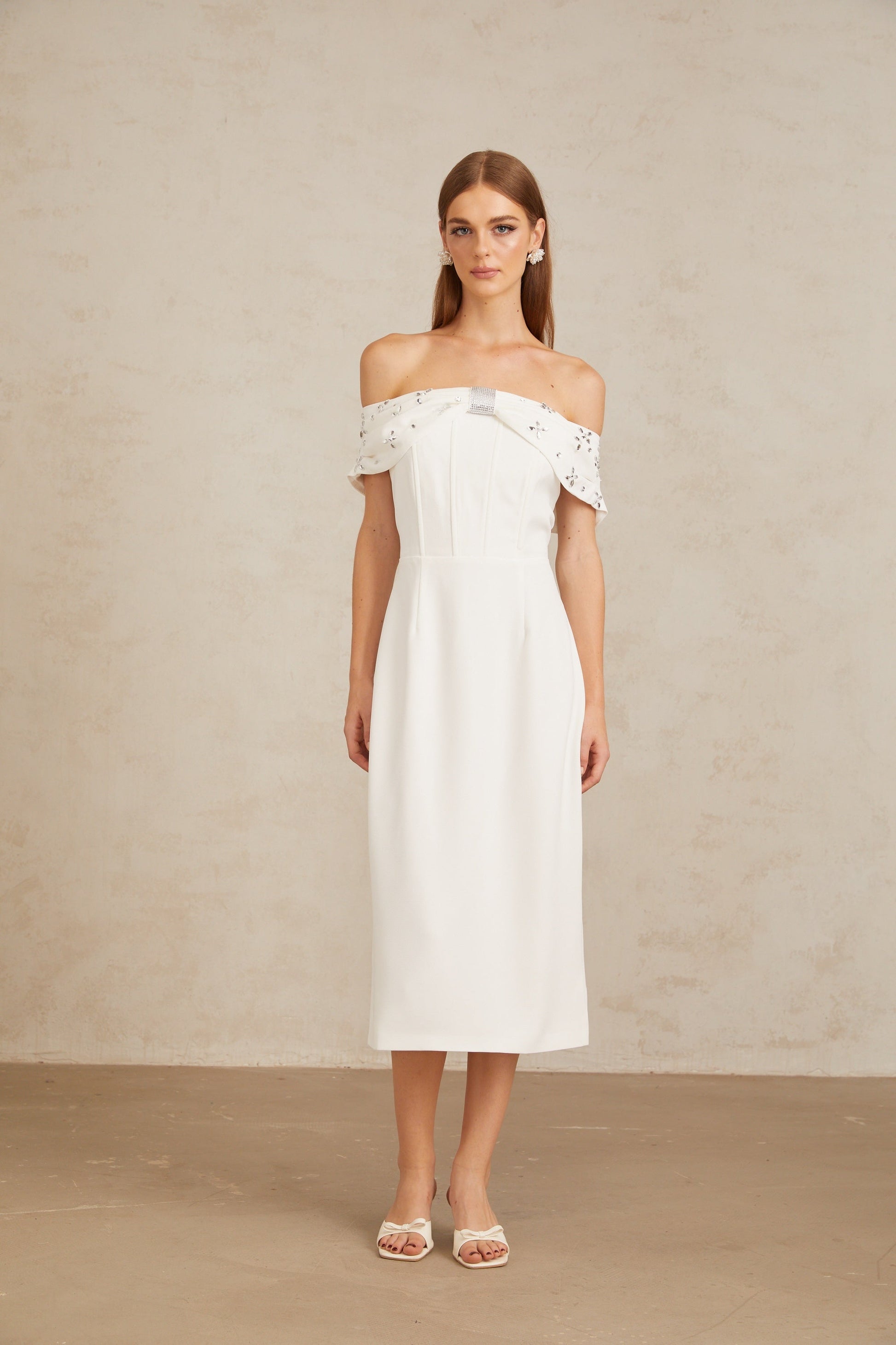Elli White Off-Shoulder Embellished Midi Dress