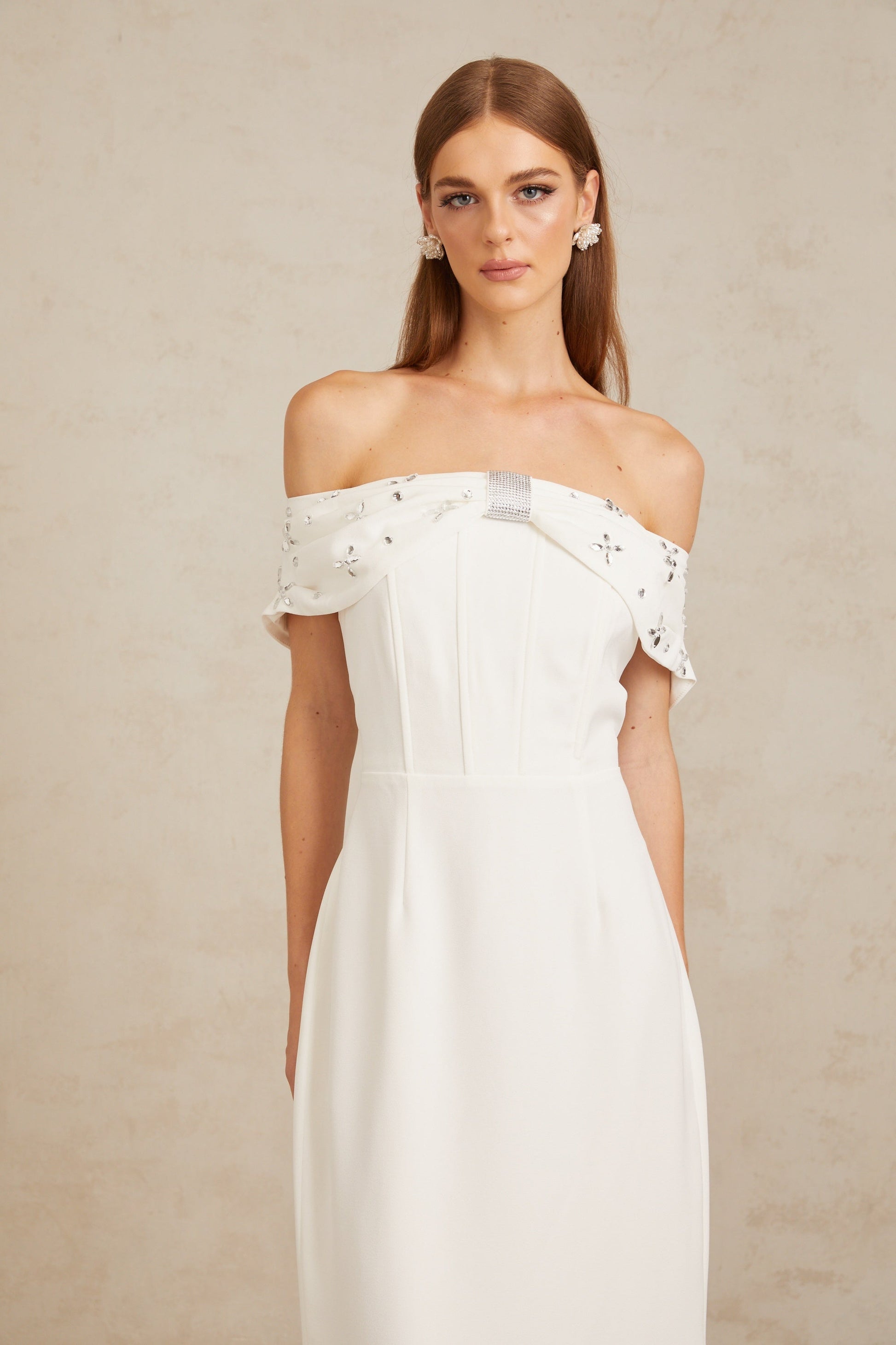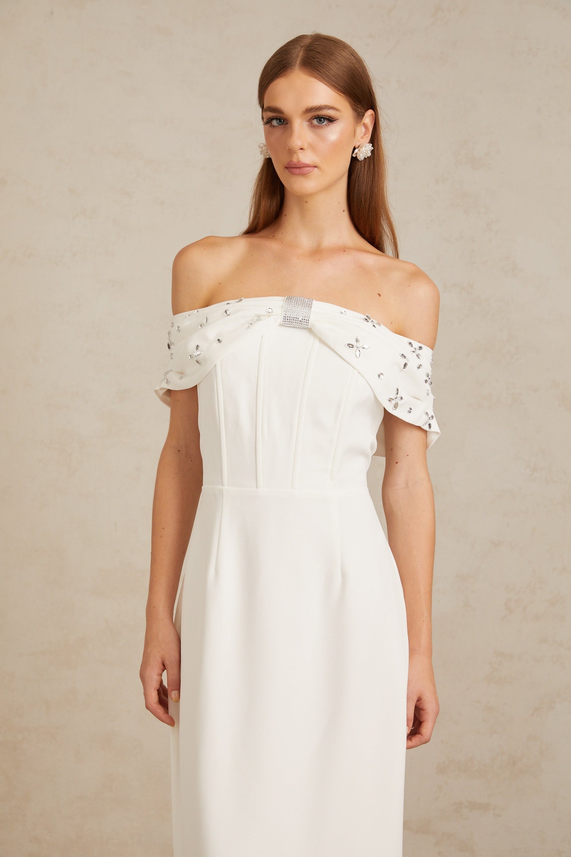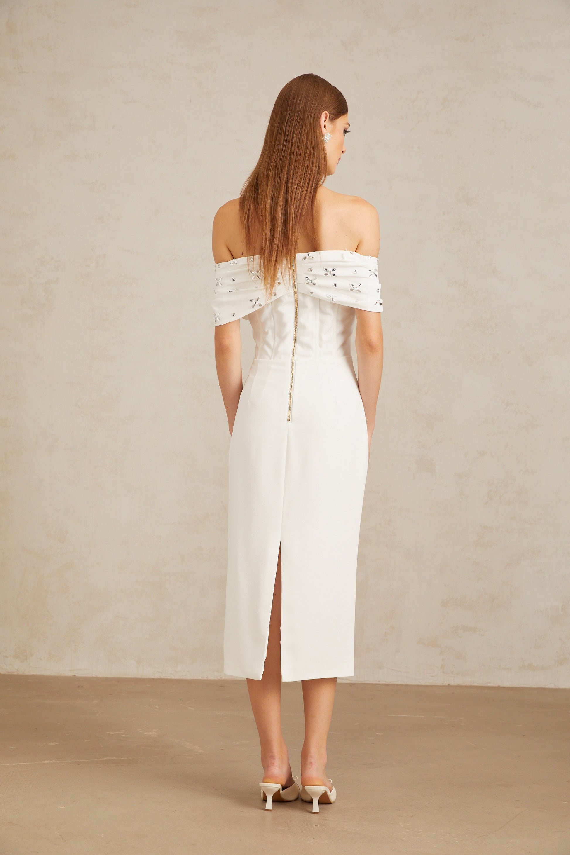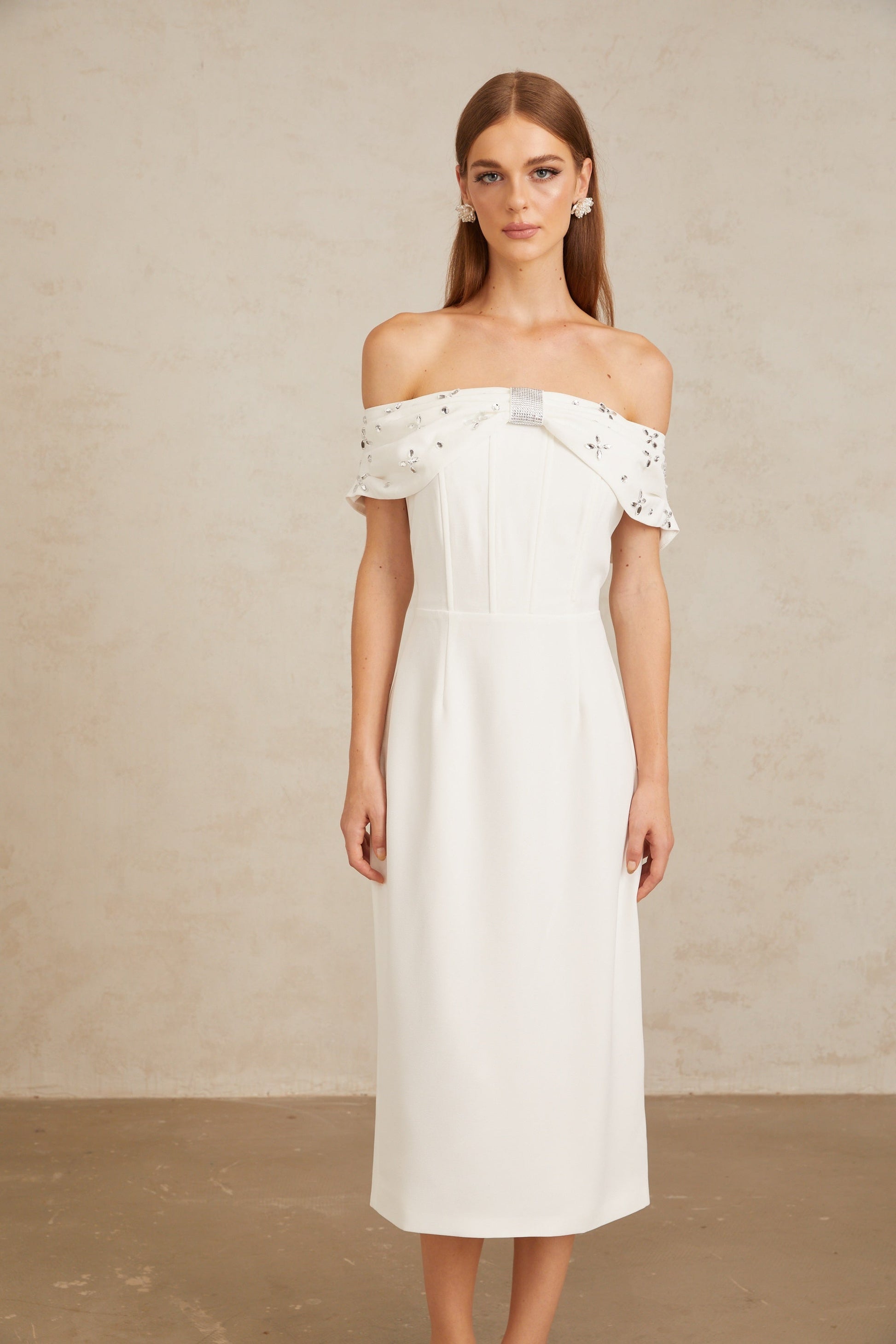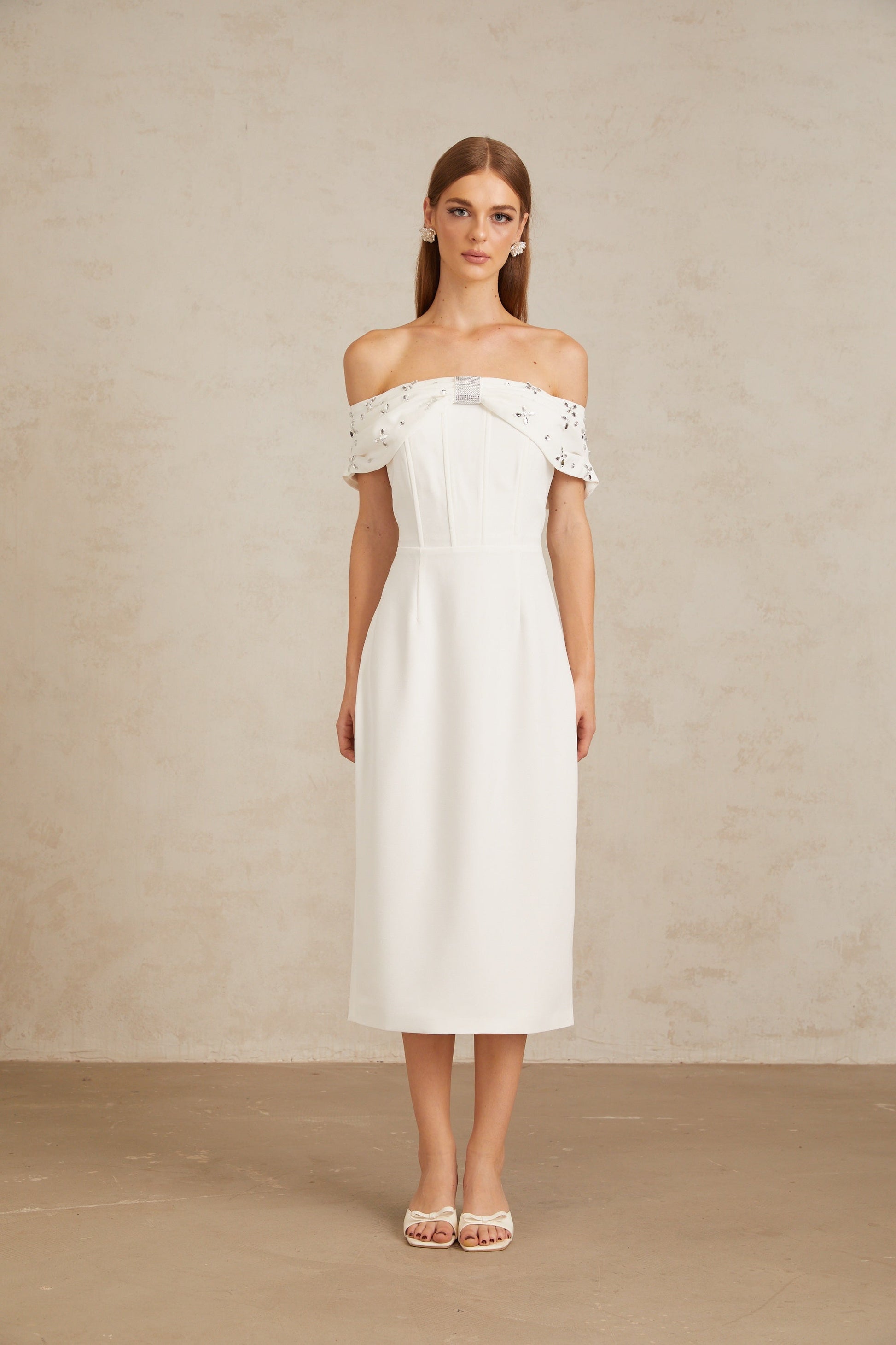 Elli White Off-Shoulder Embellished Midi Dress