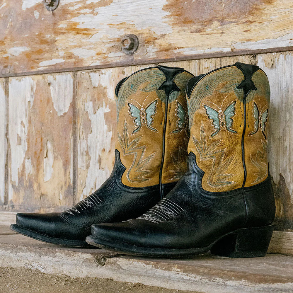 Embroidered Snip Toe Butterfly Inlay Black Cowgirl Booties for Women