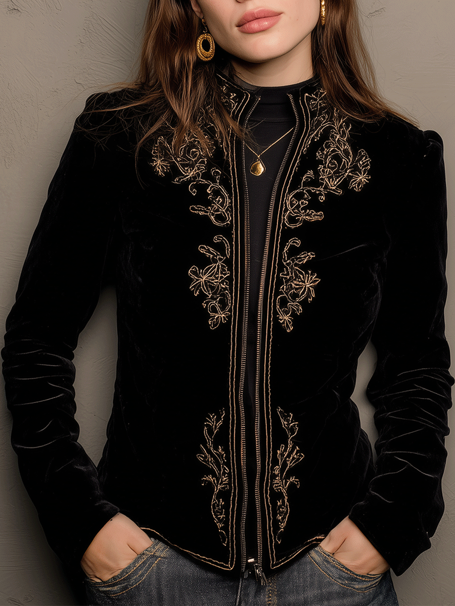 The Embroidered Velvet Zip Up Jacket is not just a piece of clothing; it's an expression of style and elegance. With its luxurious fabric and artistic embroidery, it serves as a perfect addition to any fashion-forward wardrobe, ensuring you stand out in every crowd.