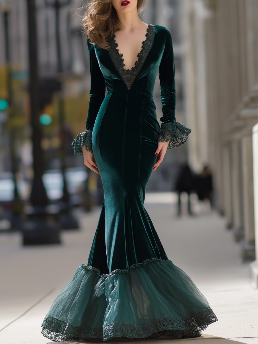 The Emerald Velvet Lace-Trimmed Mermaid Gown with Tulle Hem is a luxurious fusion of drama and refinement, designed for moments when only the most breathtaking attire will do. Cloaked in a deep, jewel-toned emerald velvet, this gown radiates regal sophistication while sculpting the figure with a flawlessly tailored fit. The plunging V-neckline, adorned with intricate lace trim, offers an alluring focal point, while the long sleeves add a touch of timeless grace.