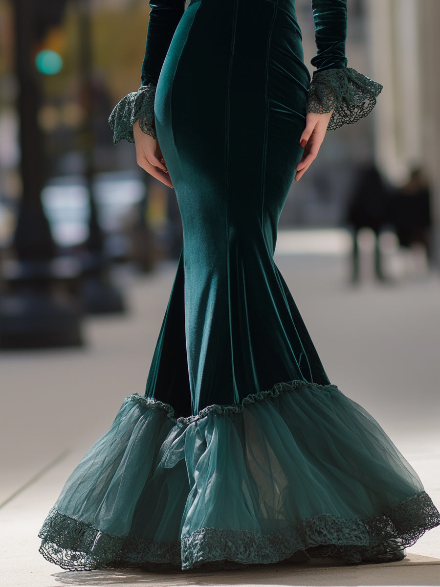 Emerald Velvet Lace-Trimmed Mermaid Gown With Tulle Hem