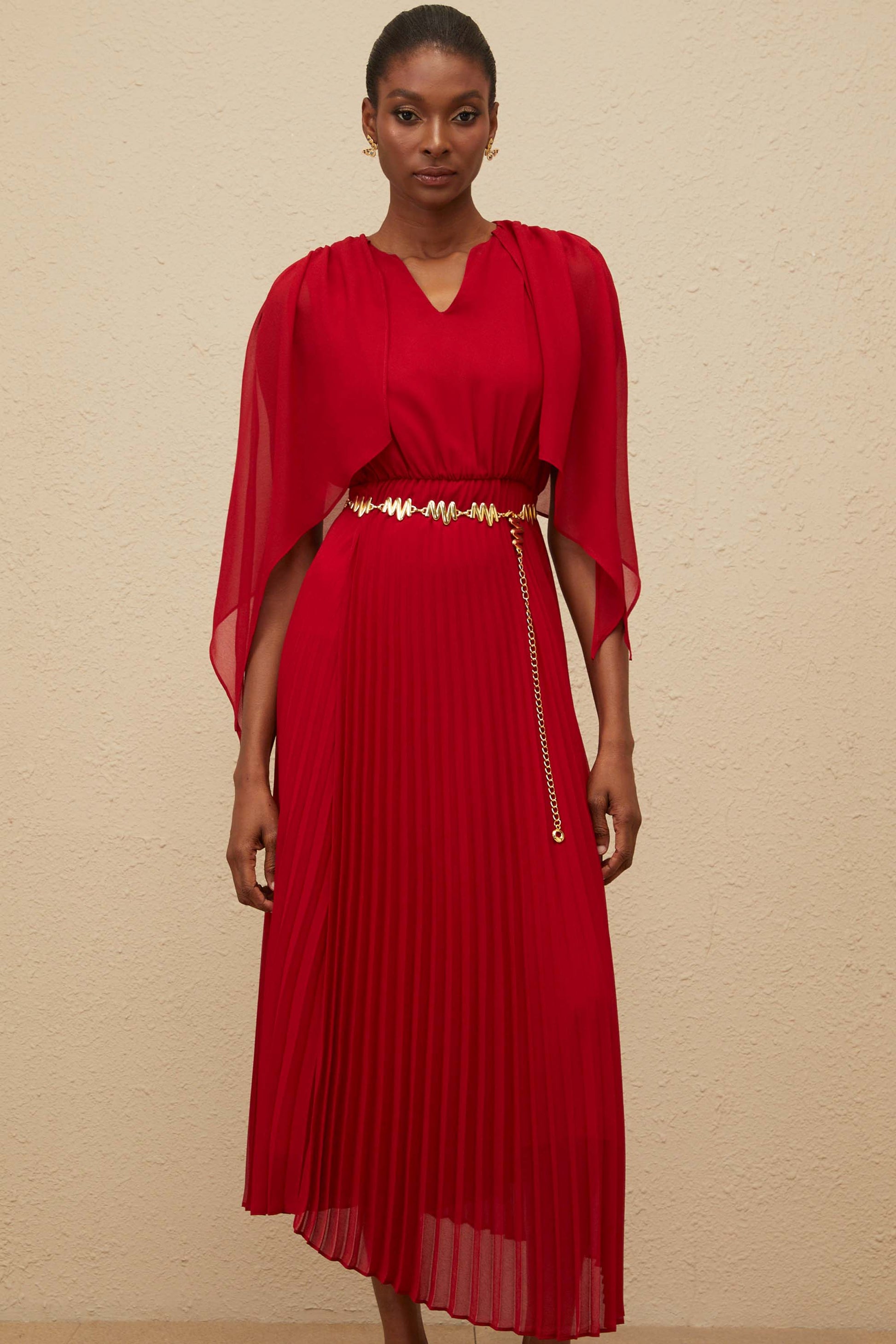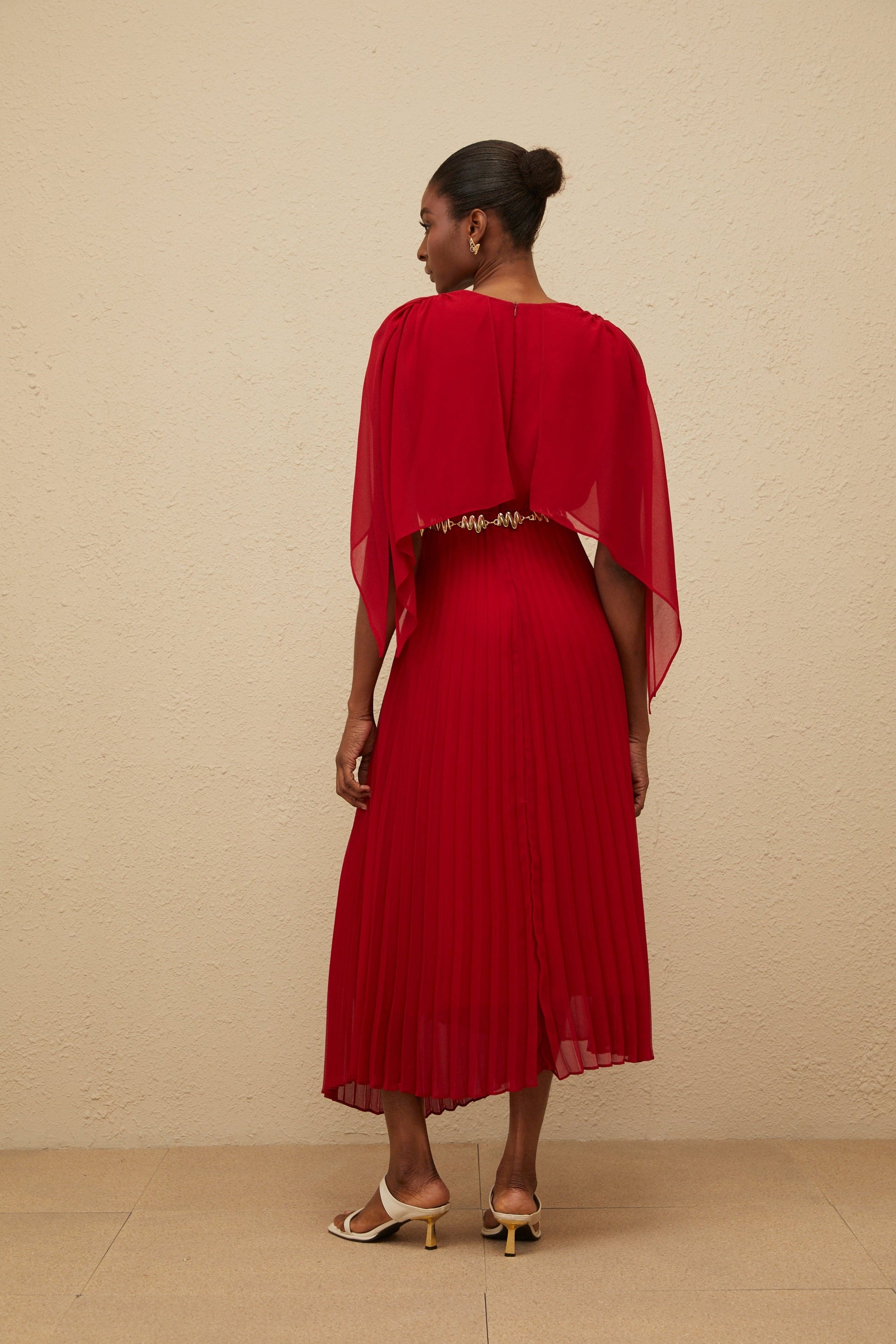Émilie Red Pleated Maxi Dress with Cape Detail
