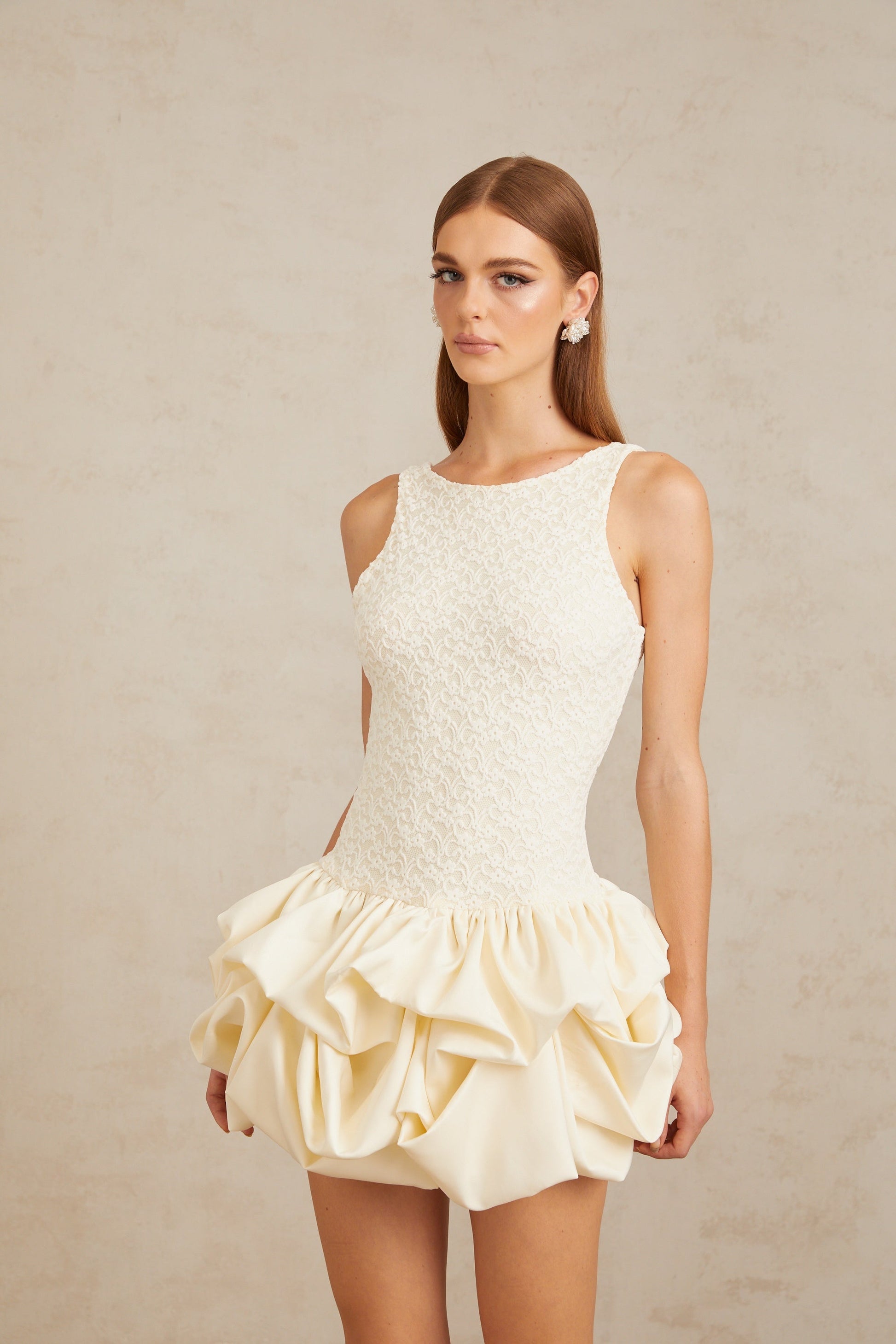 Enjouée Neutral Bubble Floral Lace Mini Dress