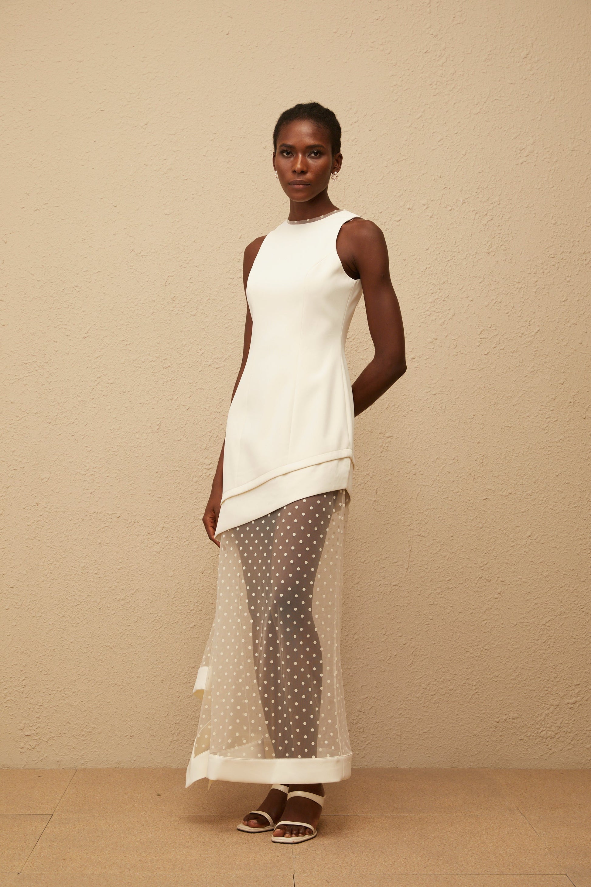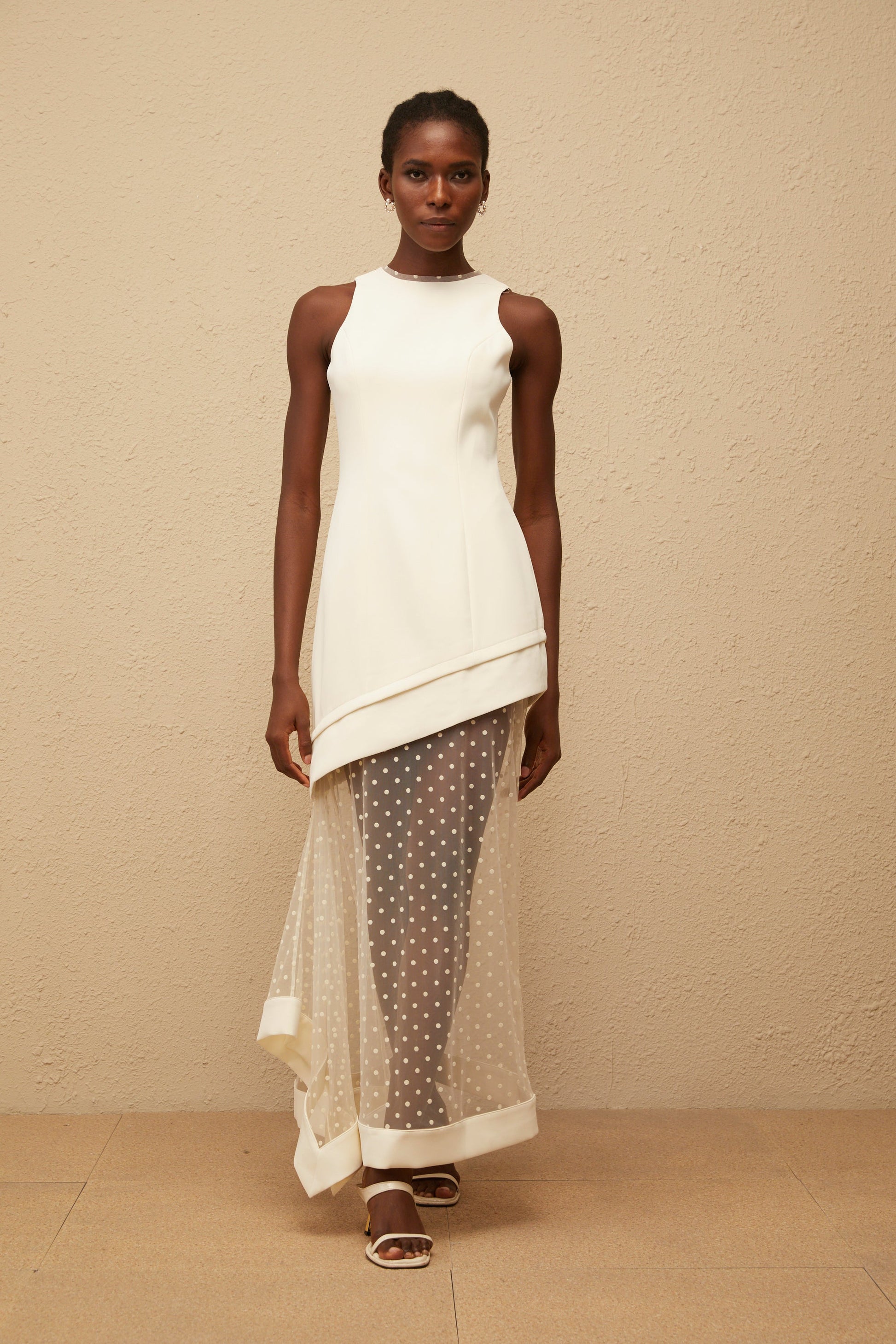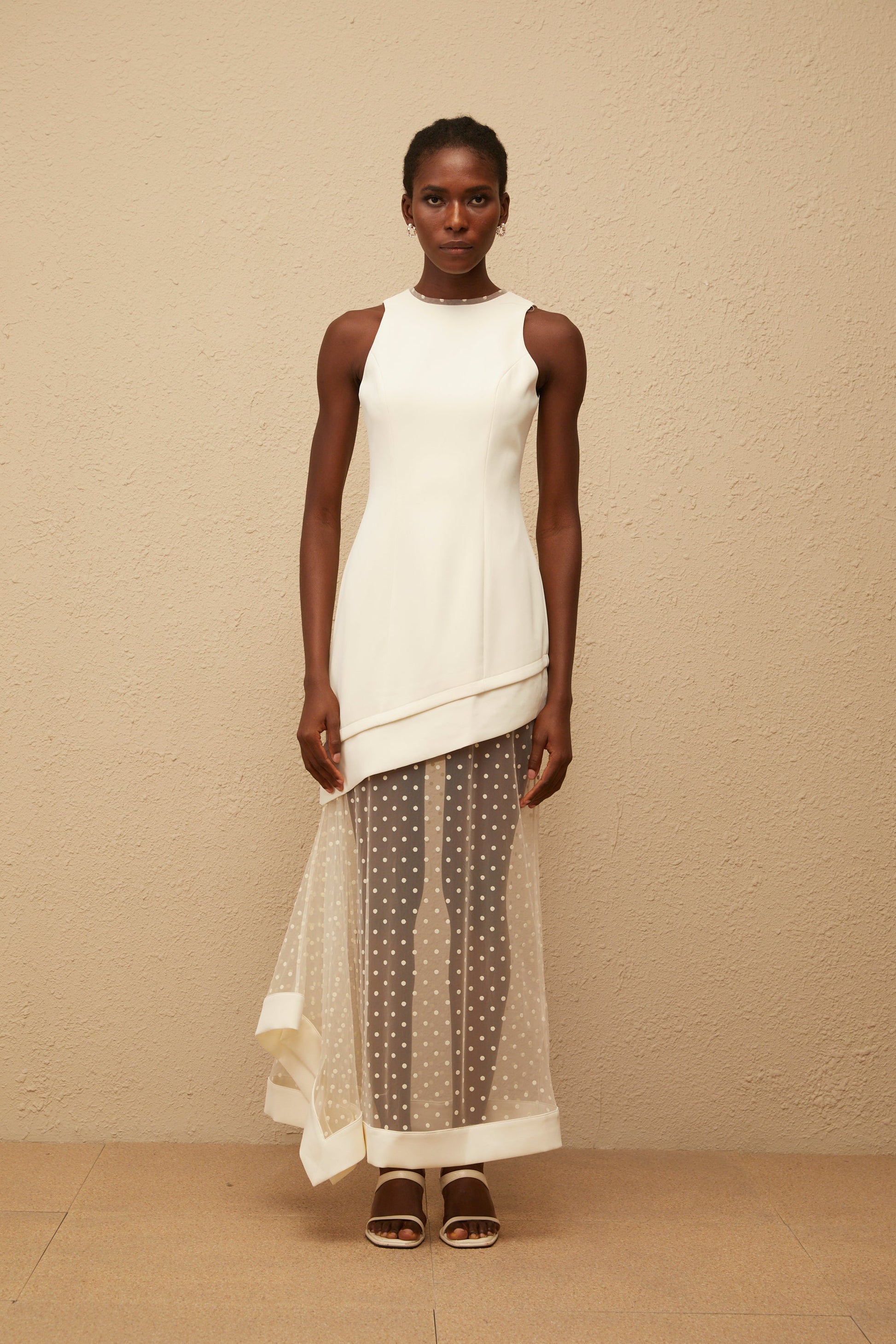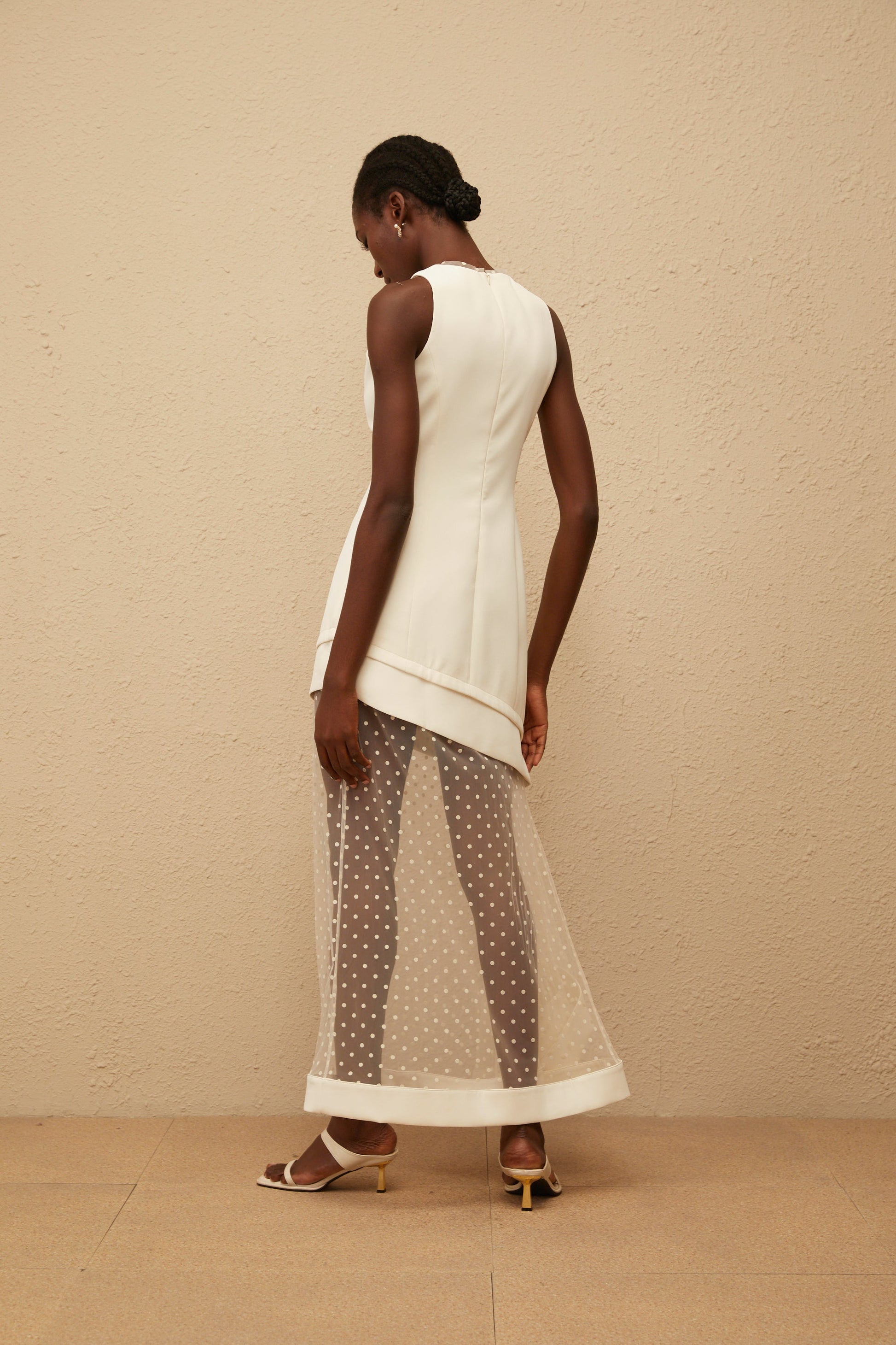 Esteri White Polka Dot Tulle Panel Maxi Dress