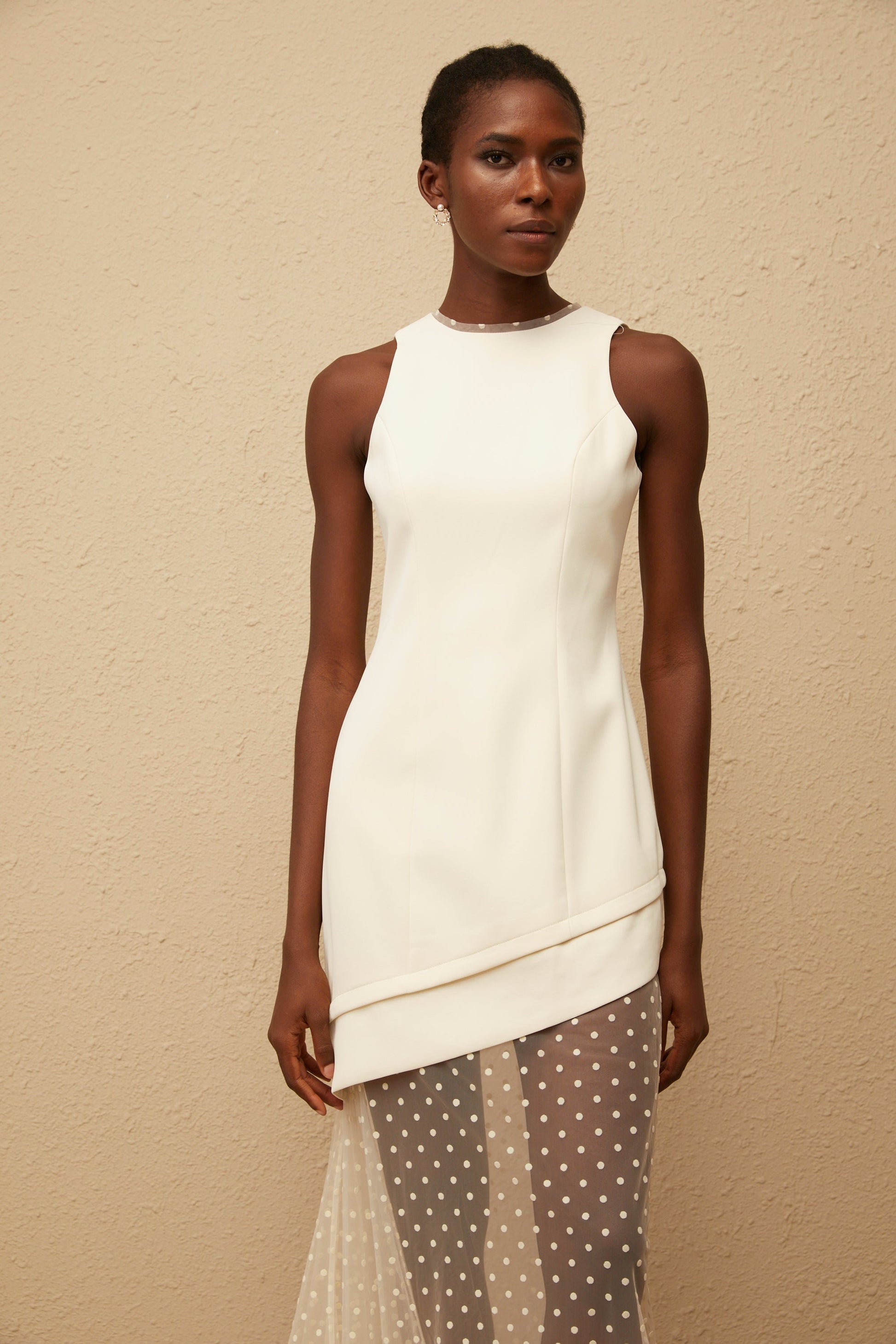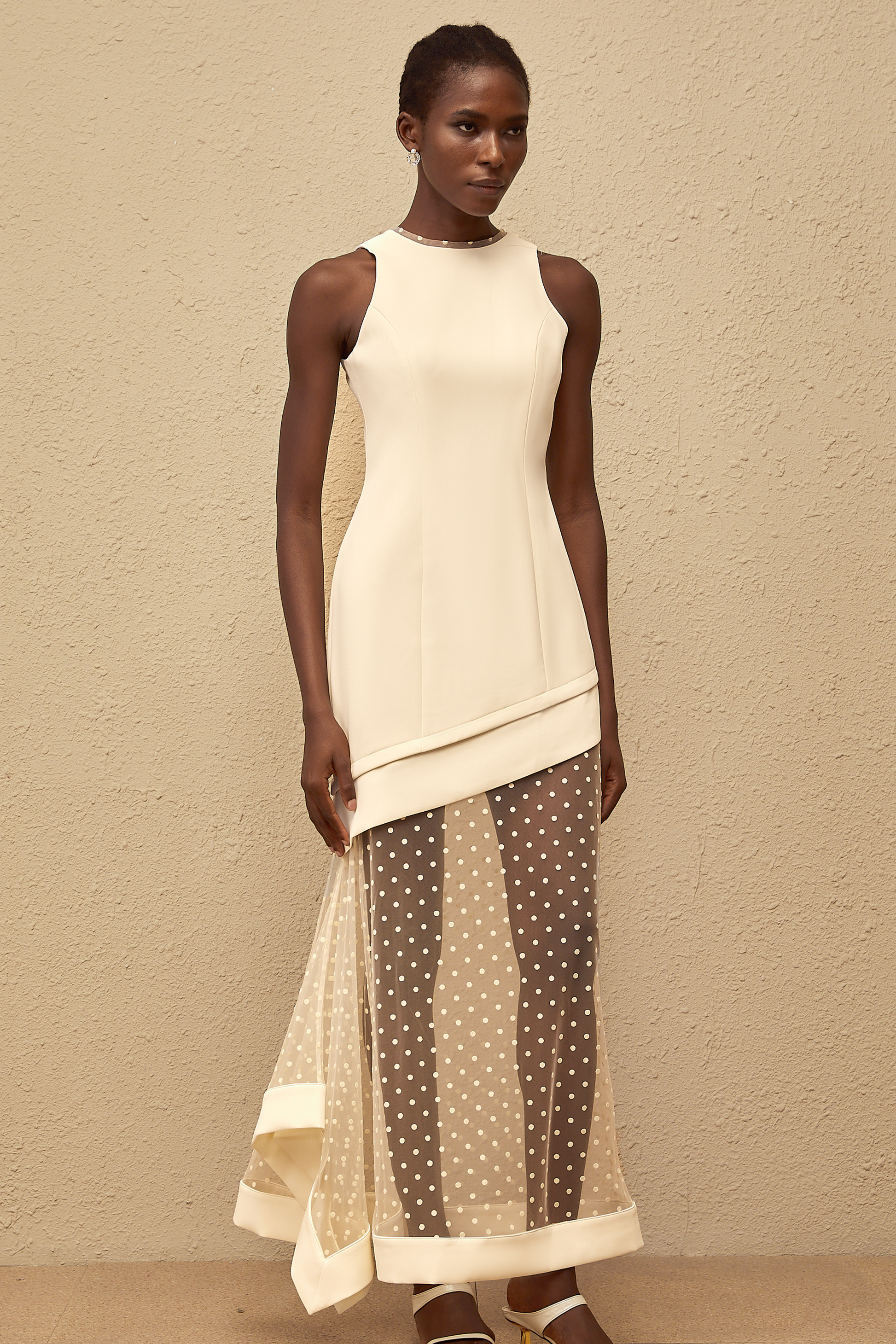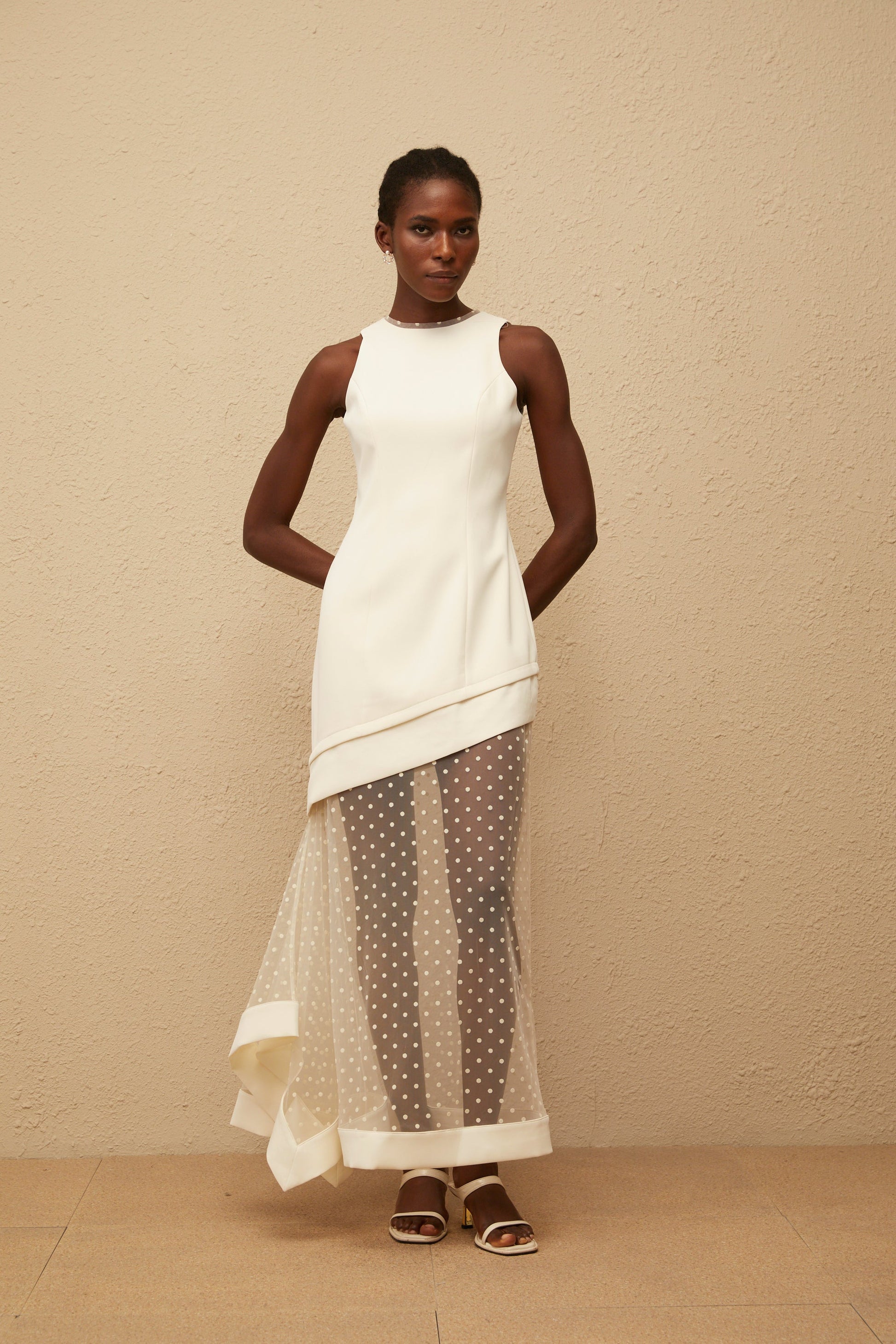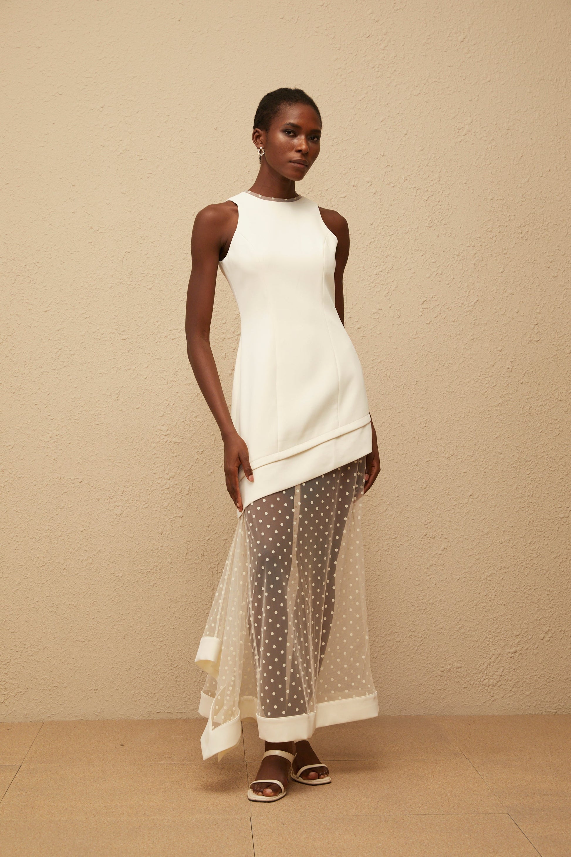 Esteri White Polka Dot Tulle Panel Maxi Dress