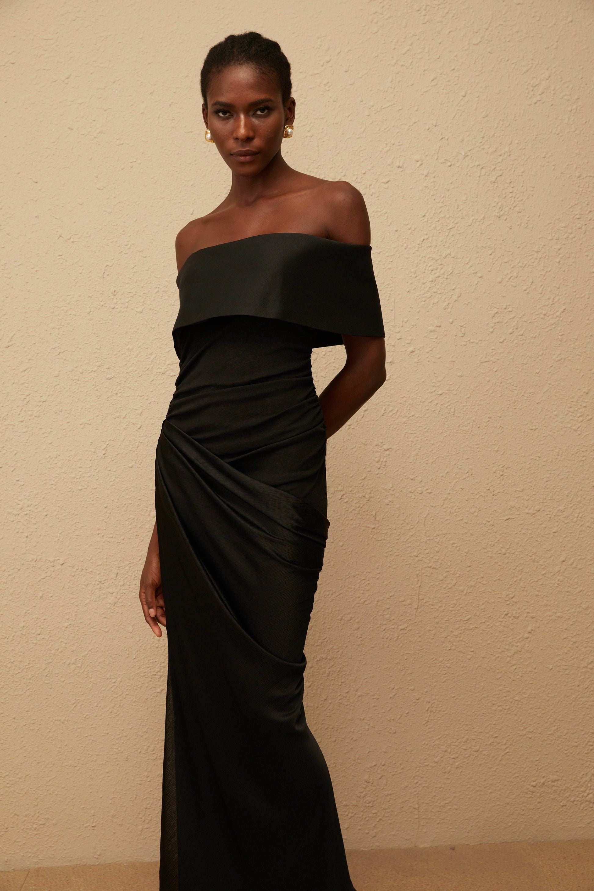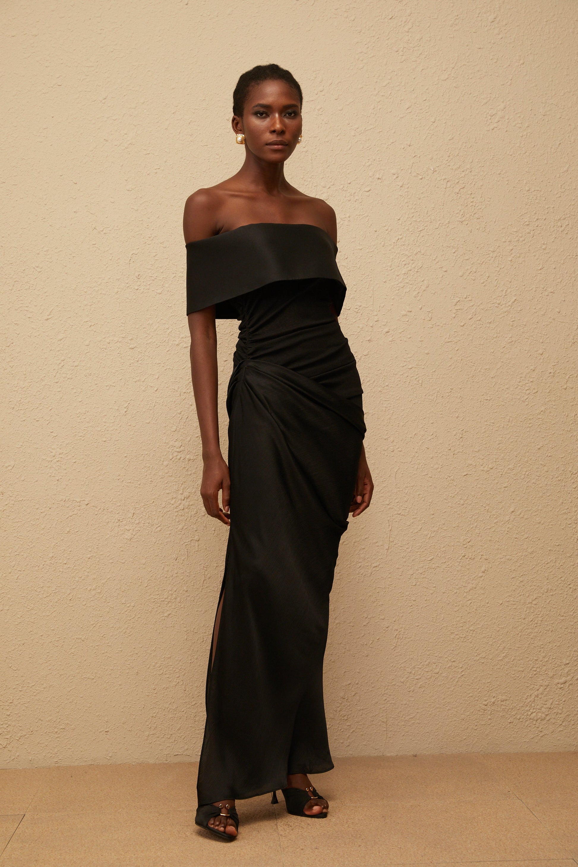 Éther Black Off-Shoulder Satin Maxi Dress