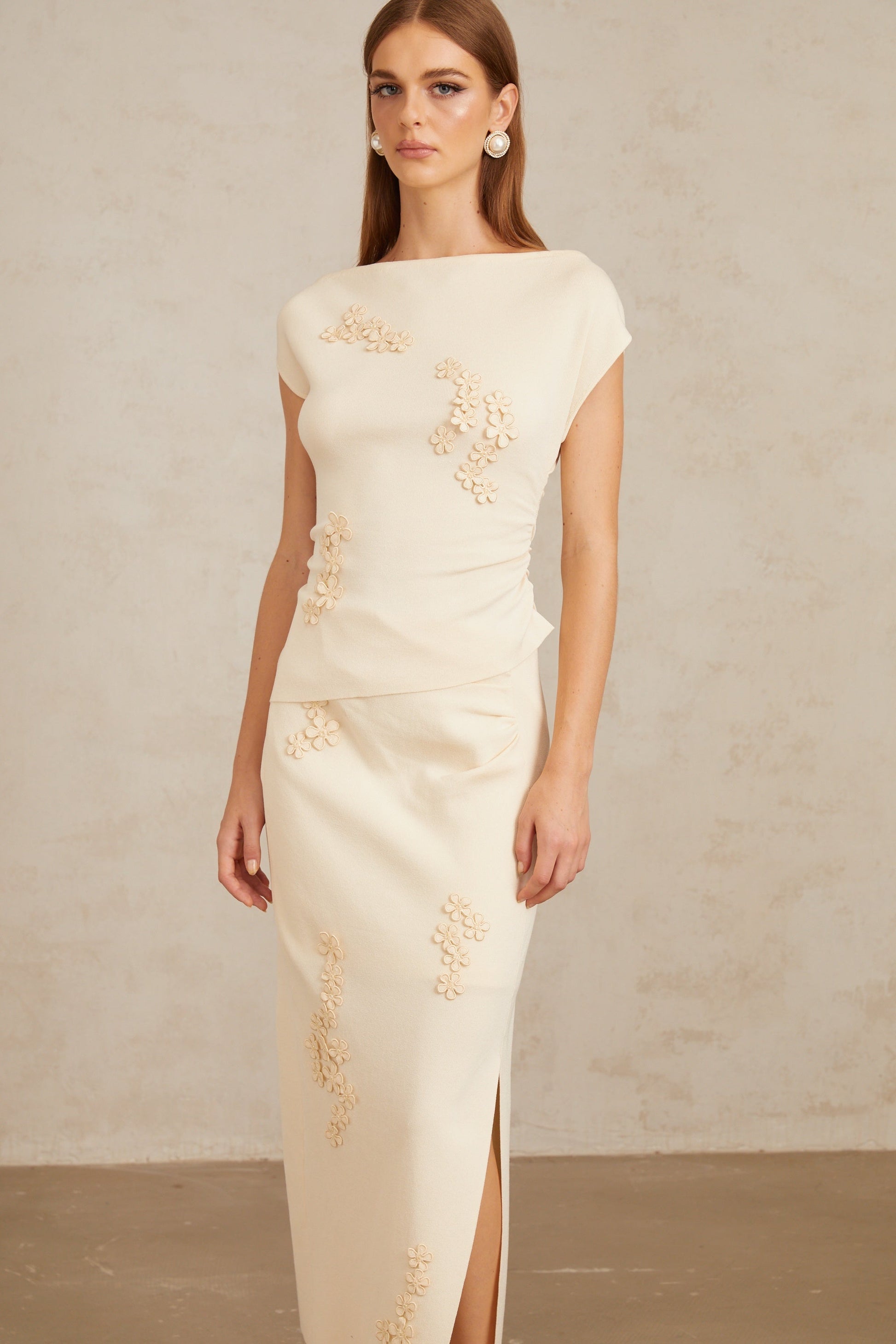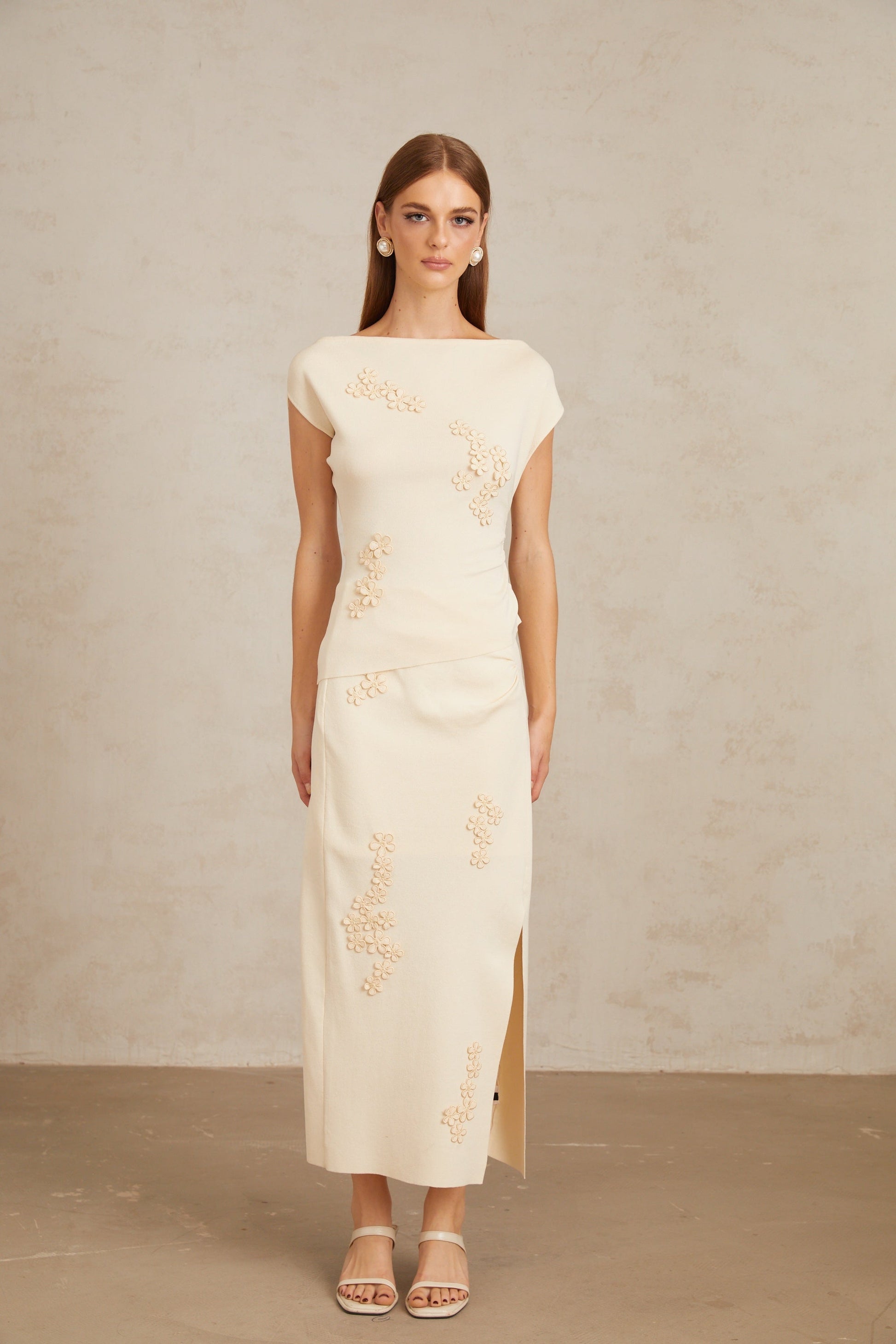 Étienne Neutral Floral Appliqué Knit Top & Skirt Set