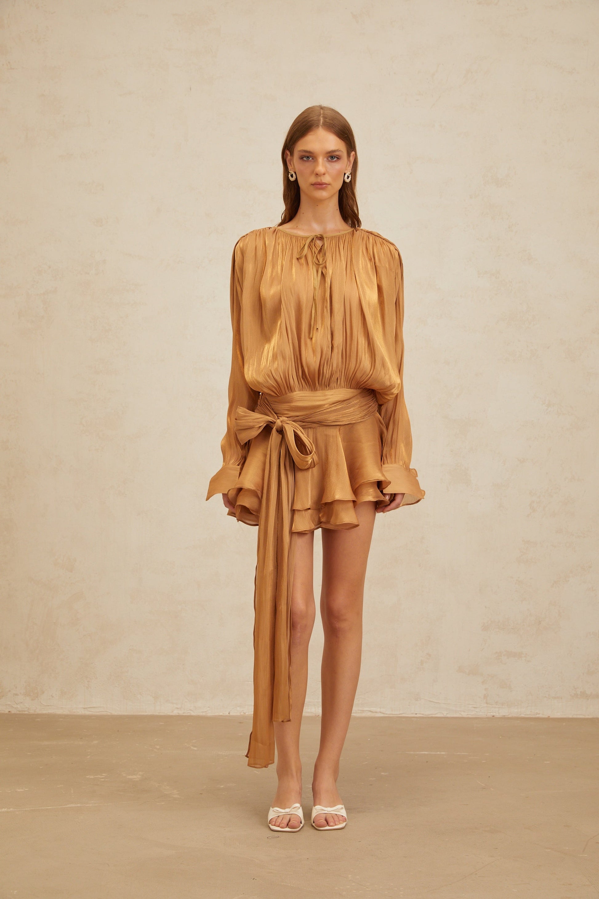 Eugénie Gold Fully Pleated Ruffled Mini Dress