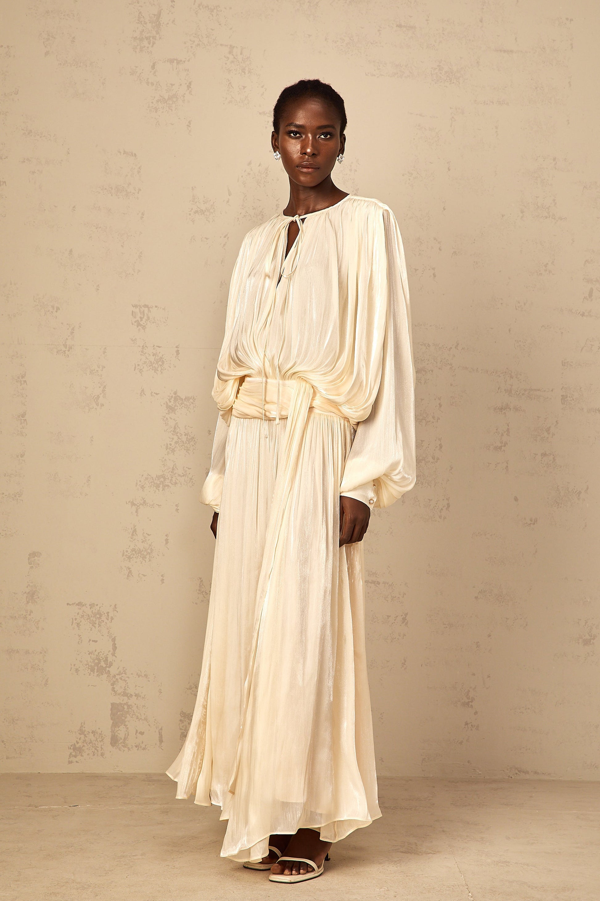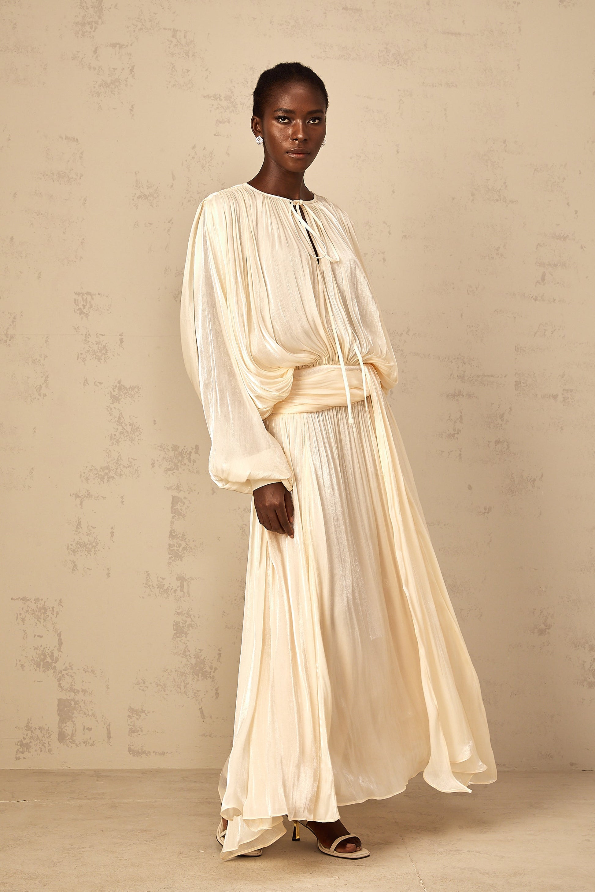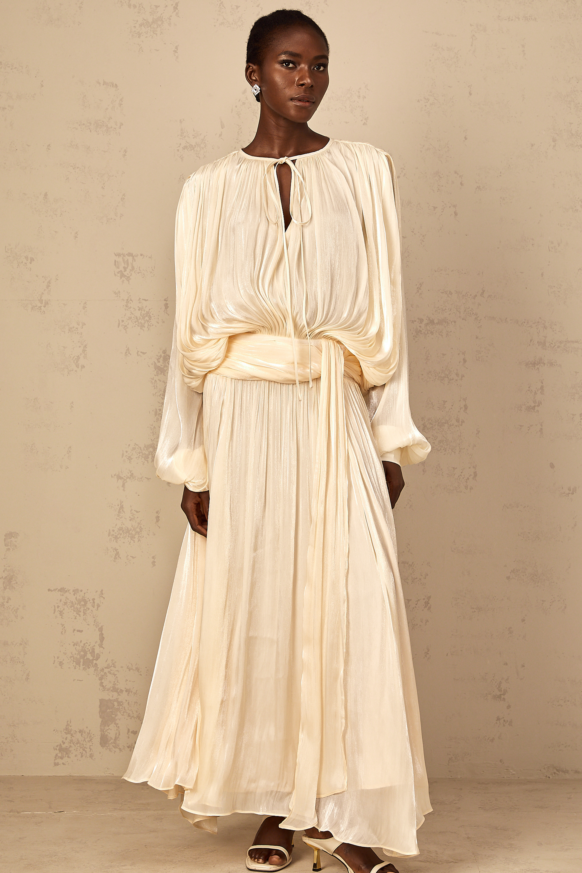 Eugénie Pleated Ruffle Maxi Dress in Neutral