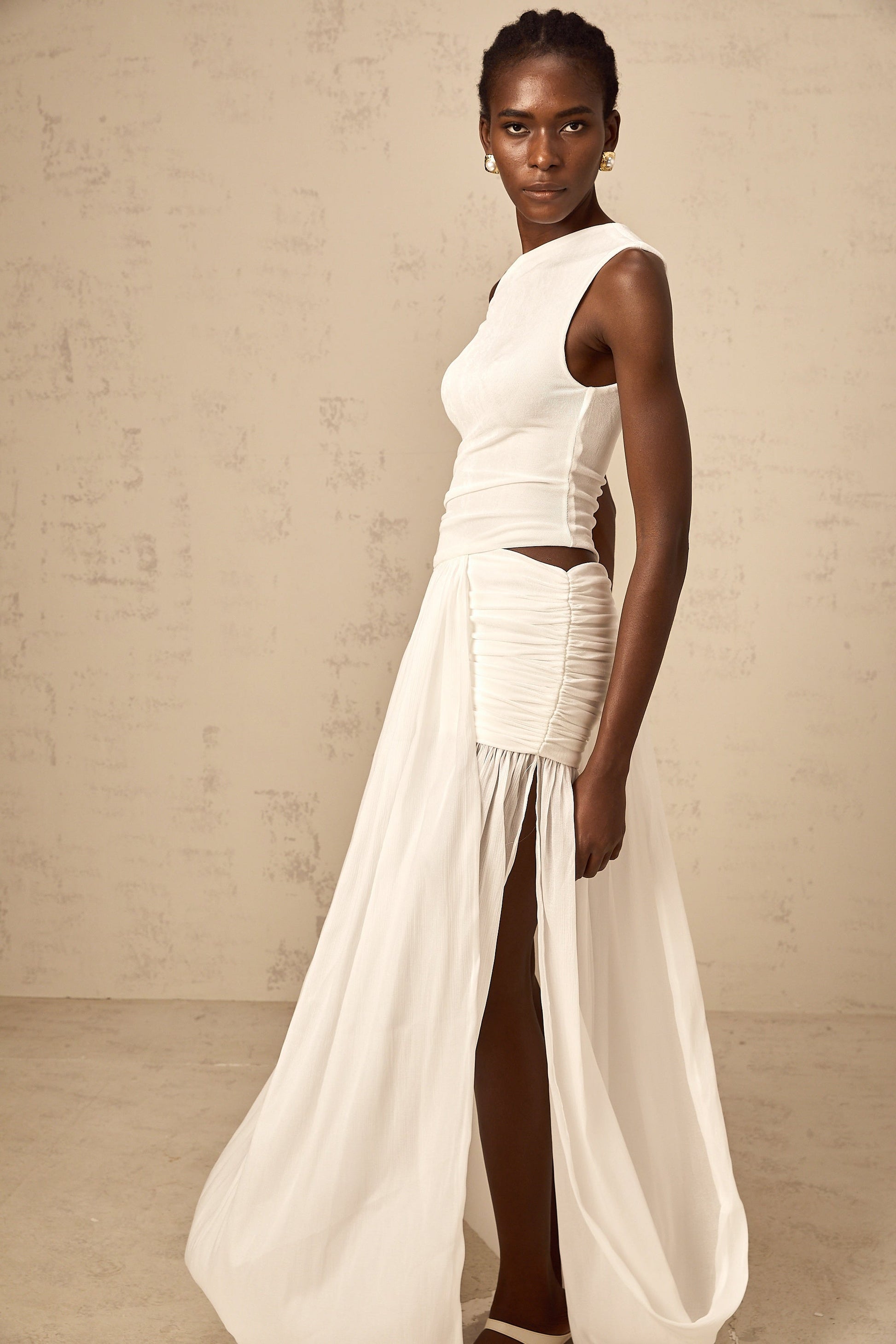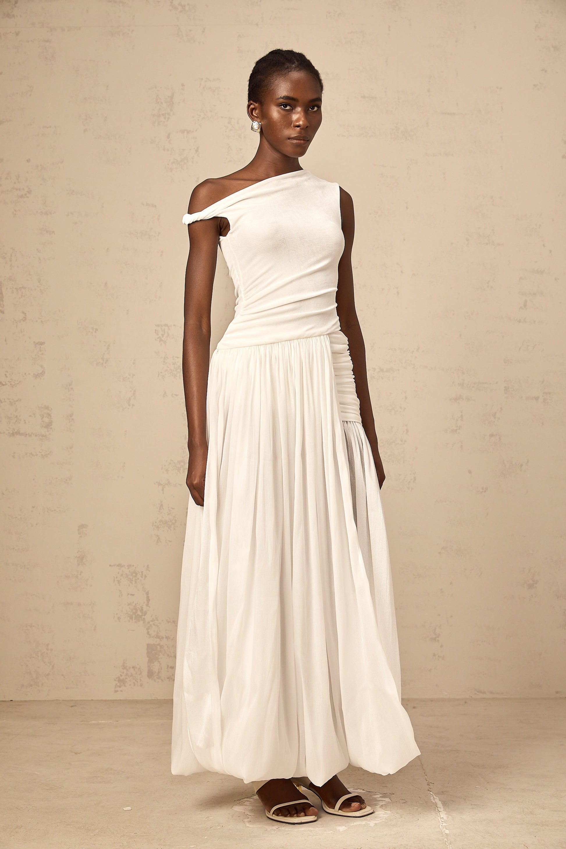 Eugenie mono-shoulder shirred-panel maxi dress in White